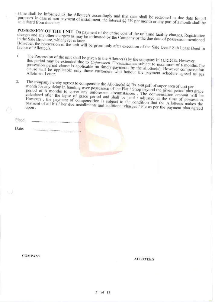 3. Penalty (Rupees 5 per Square ft.) - As agreed and promised, the flat was supposed to be ready by December 2009, otherwise the Supertech Limited would pay Rupees 5 per Square ft. as the penalty. Company sends me a possession letter stating penalty will be adjusted as per agreement, rather than adjusting the penalty assuming I will forget about it. If Supertech sending me the final possession letter, don’t you think they would adjust the penalty there. This clearly shows there ill intentions of not adjusting the penalty and get away without paying penalty.