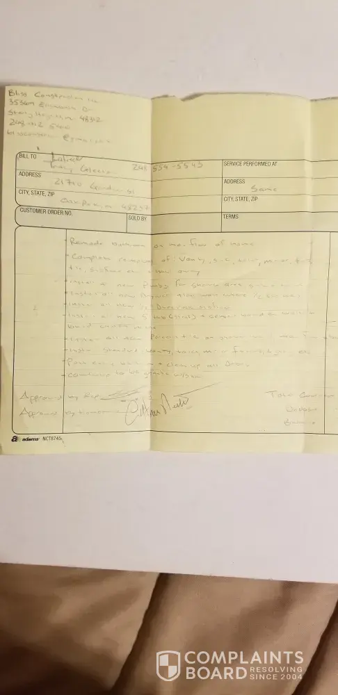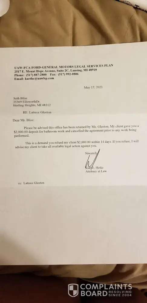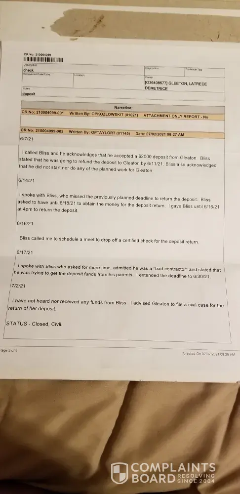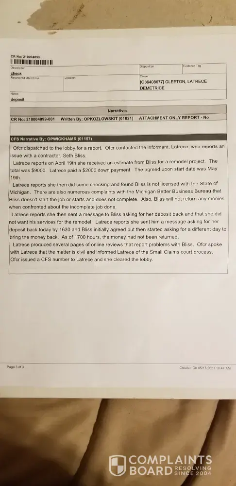 Bliss Construction/ Seth Bliss received $2000.00 deposit for a bathroom remodeling. Due to previous behavior with other customers and reviews. I decided not to move forward with his service. Requested a return of money. He won't return. I have made a police report and he has received a letter from my attorney to return the money. I will be taking him to...