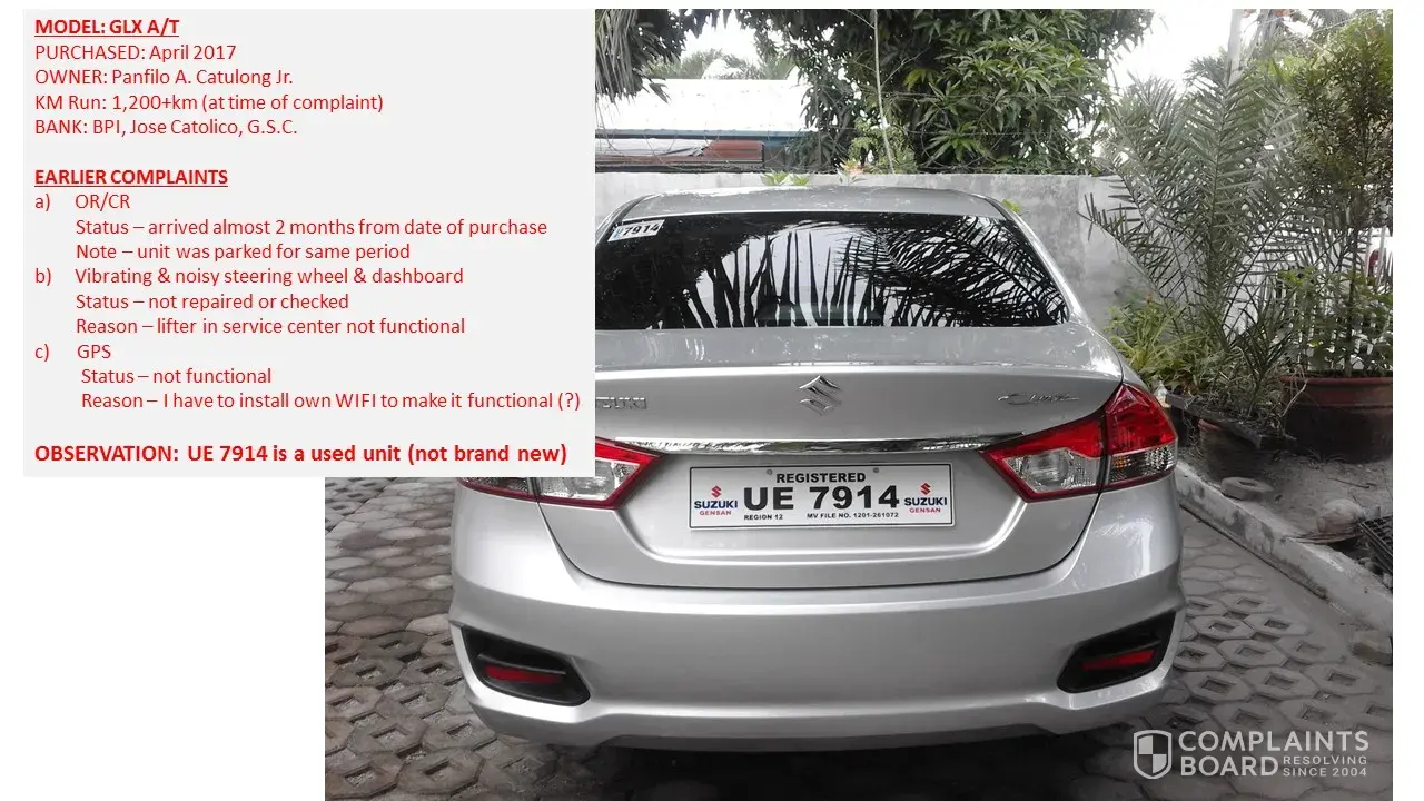 I wish to inform you of my concern regarding the subject matter. I purchased a brand new unit through a loan with BPI, Jose Catolico, General Santos City last April 2017. I found out that I was cheated by your company, the unit is not brand new. It is a used unit as far as I am concern. That explains my complaints on the noisy and vibrating steering wheel, dashboard and fading paint on the rear right side passenger door. I already reported this to your General Santos City branch and Bank of the Philippine Island branch.