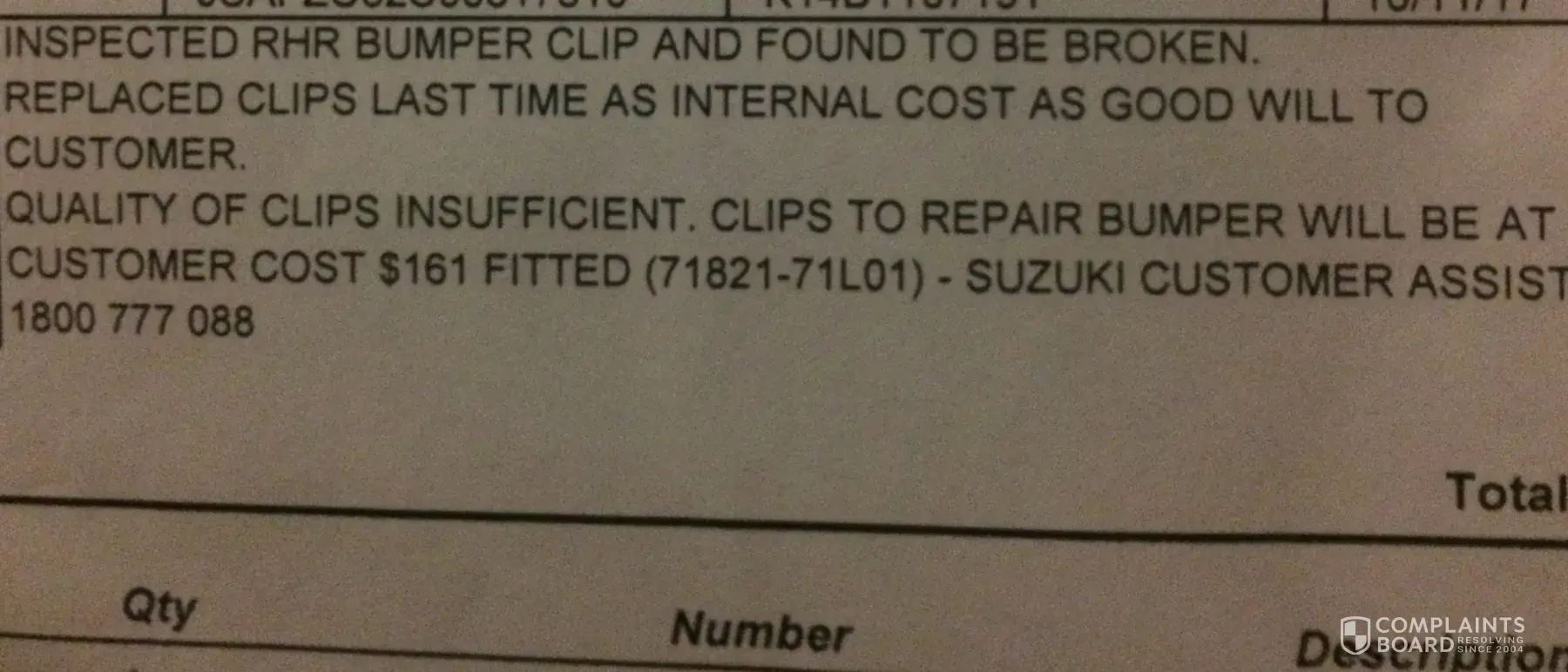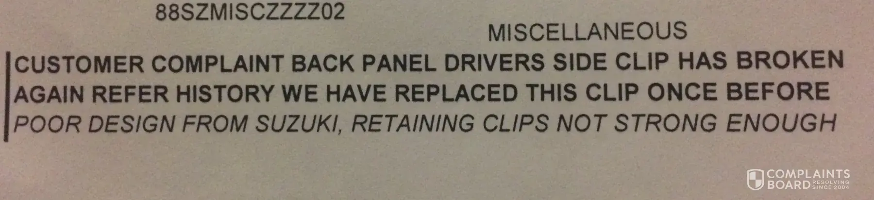My rear bumper clips have broken twice requiring repair. Suzuki AU is refusing to honour my warranty. On the 1st repair 17/07/2017 my Suzuki service centre repaired under warranty but had to buy the parts because Suzuki AU would not honour the warranty the service centre quoted the reason being "Adhesives bracket behind, poor plastic finish, replaced RHR holder bracket for bumper" a few weeks later the same thing occurred and on 10/11/2017 I took my car back to the Suzuki service centre for a service and examination of the reoccurring issue. Suzuki service centre stated "quality of clips insufficient" & "customer complaint back panel drivers side clip has broken again refer to history, we have replaced the clips once before refer to service history, poor design from Suzuki retaining clips not strong enough." The service centre advised me to contact Suzuki AU to negotiate a repair under warranty and they had also contacted Suzuki AU requesting the repair be covered but Suzuki AU refused. I emailed customer service requesting repairs and they stated -
