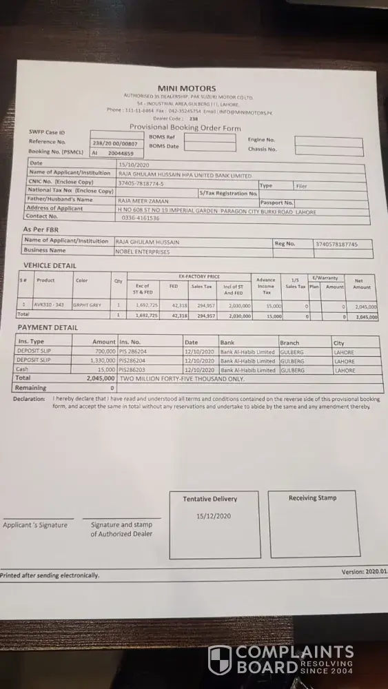 I have booked a car (Cultus AGS) through UBL Bank and mini motors, under the booking id-[protected] and got the delivery date of 15th Dec 2020. It's been 4 months now and still it's not handed over to me. I have called several times to the bank and booking agent and they are unable to give me any update. Can i get any update on this? Why is so late? How long it's going to take?