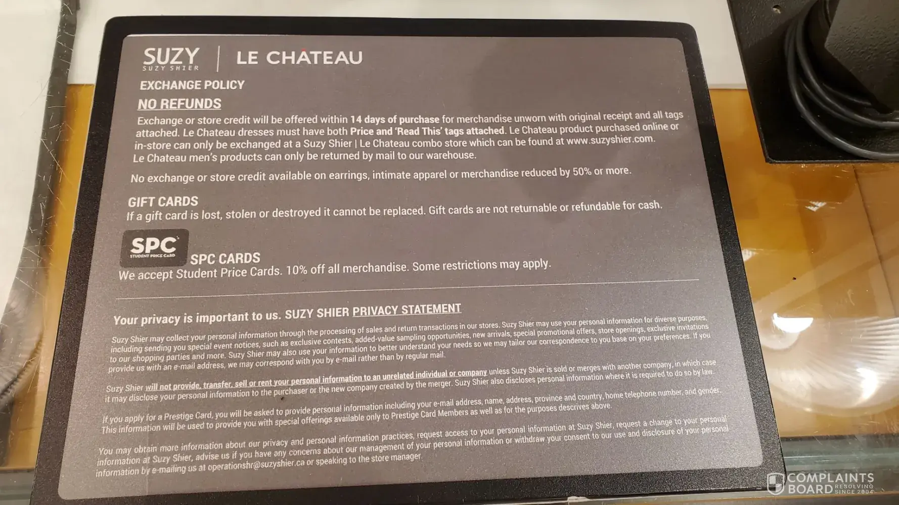 Careful shopping in the Calgary downtown location! They don't honor their exchange policy. Tried to exchange a set of bracelets. Was told jewelry can't be exchanged but their policy clearly states: No exchange or store credit available on earrings, intimate apparel or merchandise reduced by 50% or more." None of this applied to my purchase yet an exchange was refused. Escalated to the District Manager who in an email, confirmed, he is also unaware of the stores' policy as he also said jewelry could not be exchanged. Either honor your existing policies, Suzy Shier, or change the wording. Simple.