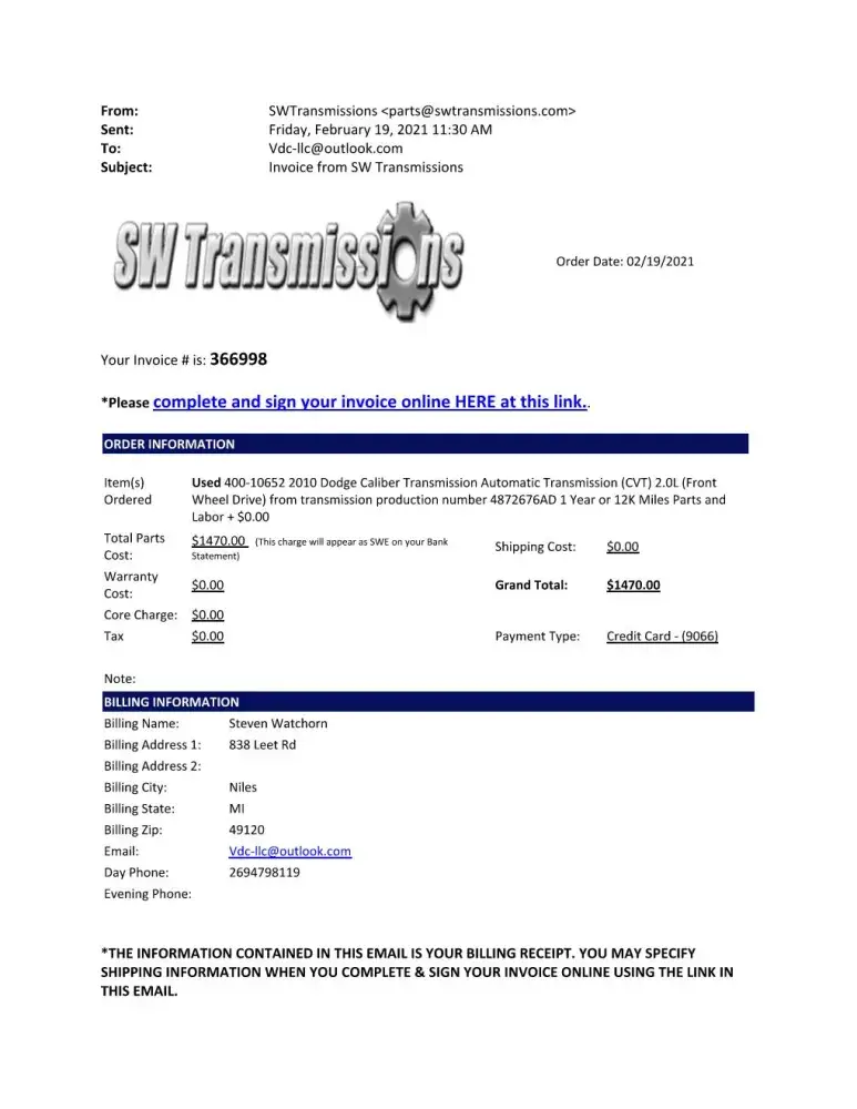 I was interested in purchasing a transmission for my 2004 Toyota Sienna so I called SW Transmissions to inquire on June 1, 2021. They had one available; I gave my Credit Card Information over the phone, but I did not have my mechanic's shipping address so the Rep I was speaking with said she'd send me an email where I can fill out the shipping address. The email they sent me included and invoice # of 374581. I contacted my mechanic by voicemail and was waiting to hear back from him. In the meantime, I researched SW Transmissions and found that they had several complaints from customers.
