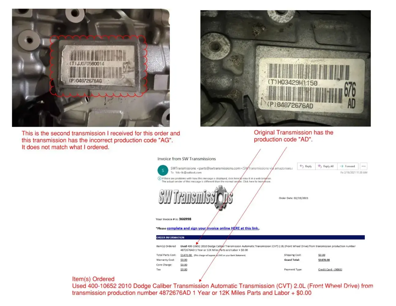 After immediately receiving the second item I contacted SW transmissions to inform them this appeared to be an incorrect item. The Transmission looked similar however the Production number was not the same as what i originally ordered. I received an Email back from Dale @ SW Transmissions asking me to have it installed reassuring me that this would work in the vehicle.