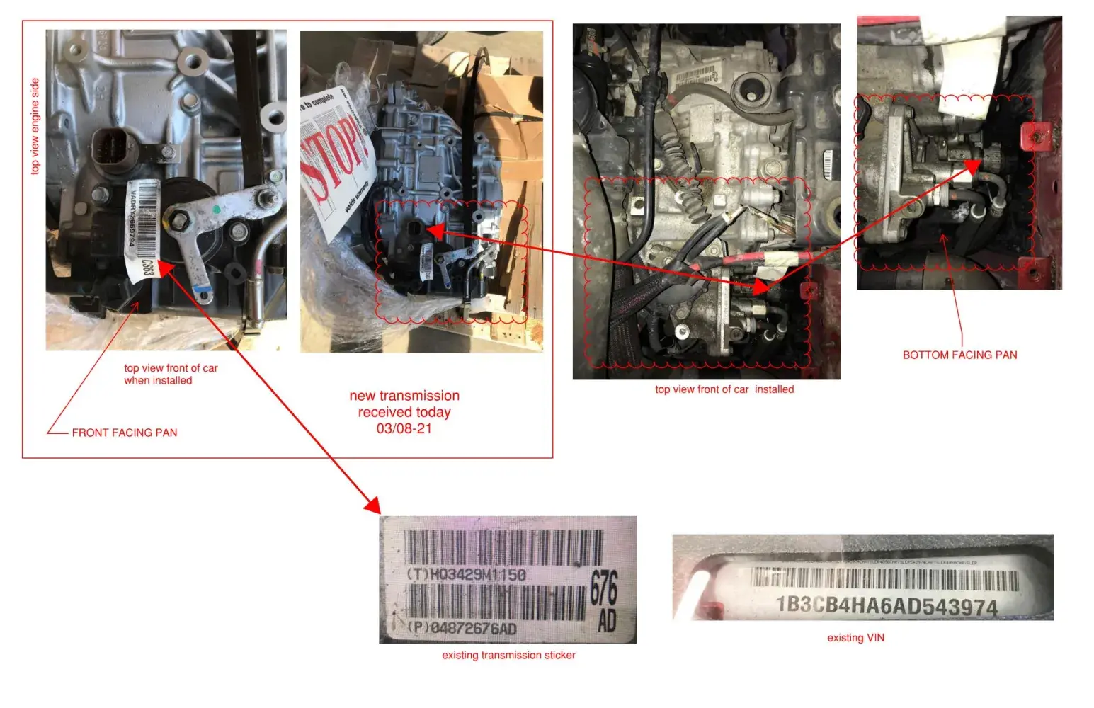 Purchased used transmission "4872676AD" for $1, 470.00 on 2/19/21.