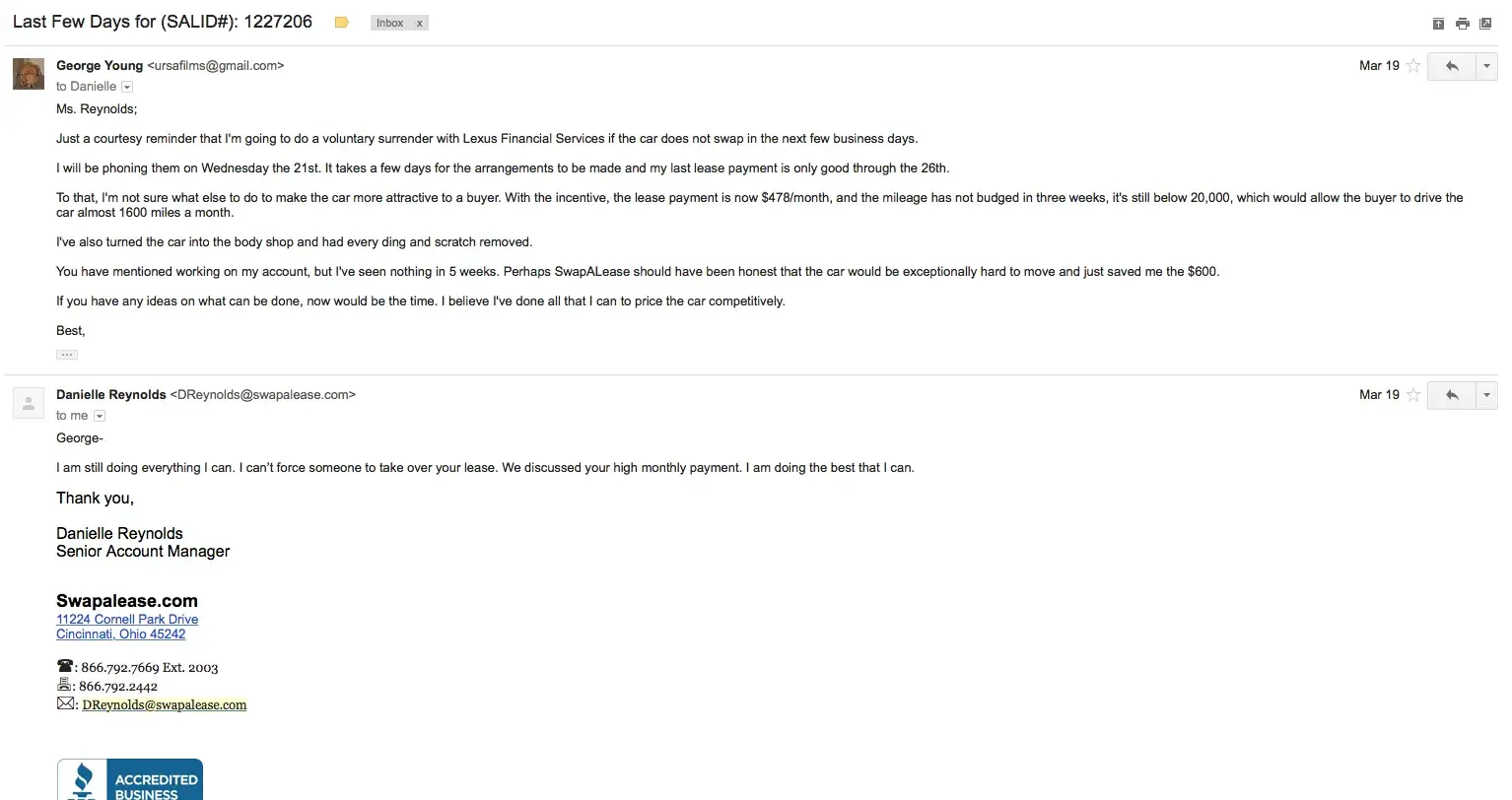 Had I purchased one of the cheaper options which would have left things more or less completely up to me, I would be fine with the inability of the car to have the lease transferred, but the $600 fee seemed to imply that SwapALease would assist me in getting potential buyers and working with me to transfer the lease.