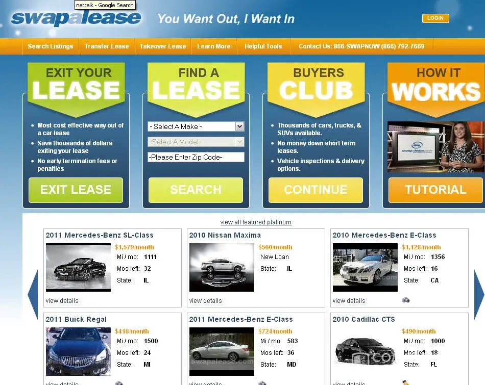 “I signed up for Swapalease’s Platinum advertising service in early August 2011. The cost was $300 and that covered their “top” advertising until my 2010 Mercedes E350 sold. Results: five prospective buyers responded to the Swapalease Platinum ad to date, none serious. Conclusion (mine) Swapalease Platinum advertising is highly ineffective, would not recommend my friends use Swapalease. It has been a waste of time and money.”
