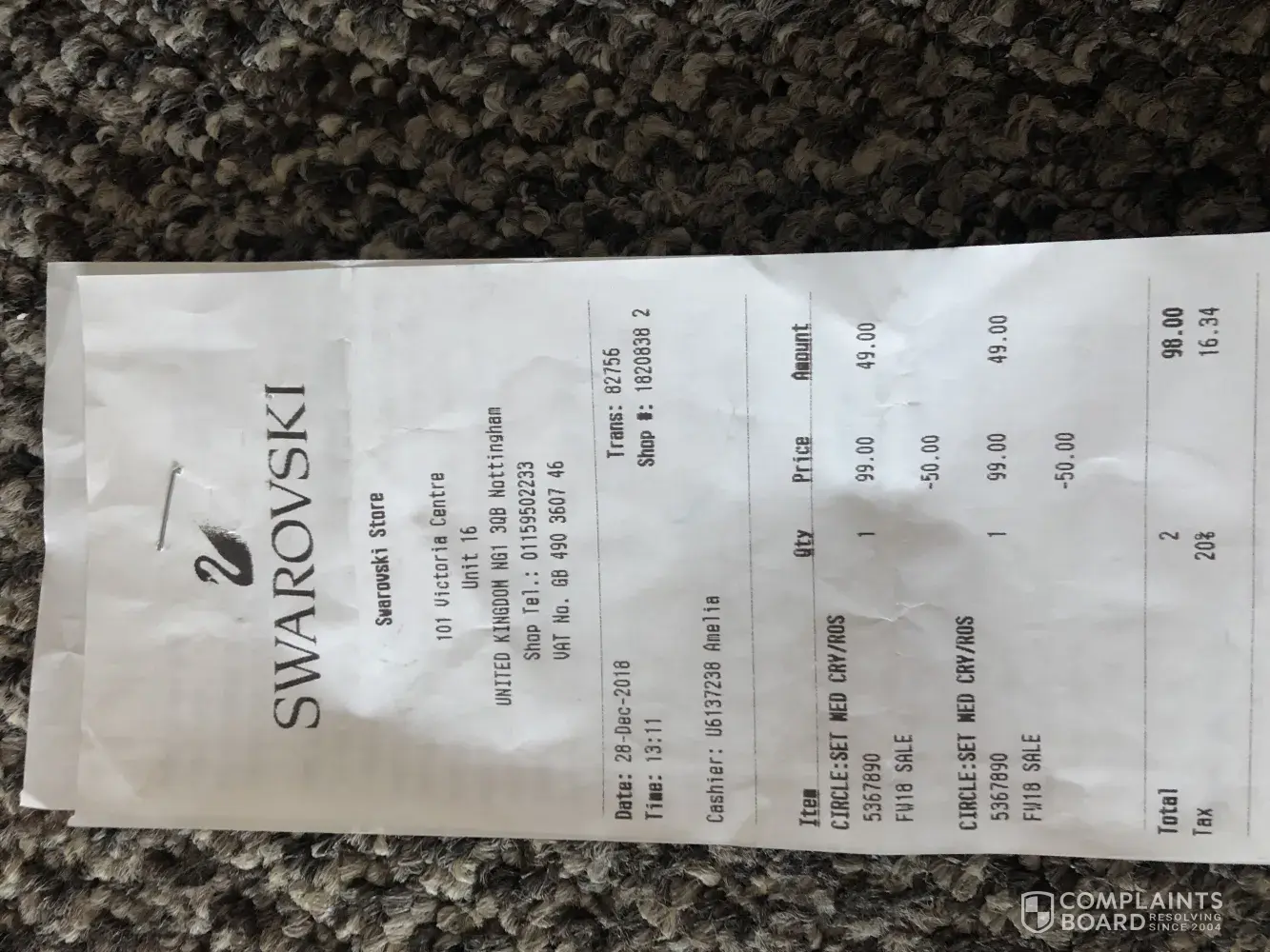 On 28th of December 2018, 13:11 time, at Victoria Centre Nottingham, Swarovski shop, I bought two presents sets. Both was the same, bracelets and earrings. I paid for each £49.