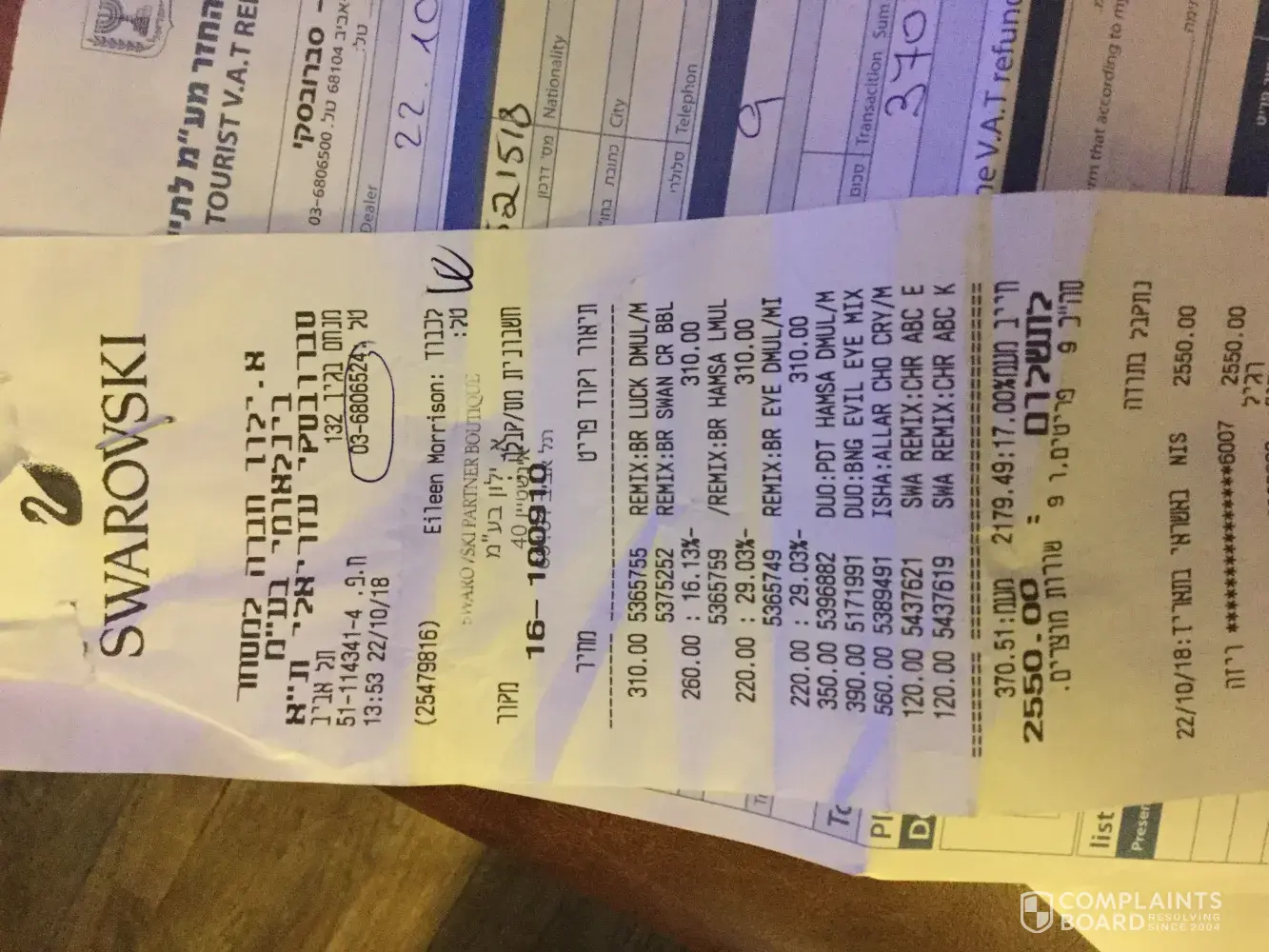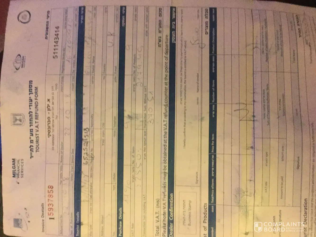 On holiday in Tel Avive we visited your shop in and purchased some of your jewellery and we were told that the VAT would be refunded at the air port, but we had to go to another of your shops to get the correct forms. The cost to get to the other shop was £20 return. But the refund was going to be around £90 so we decided to go and get the forms as directed by your staff. When we got to Tel Avive airport to return to the UK we presented the receipts and the VAT forms to the VAT office where we were told that they were illegal and not acceptable for refund.