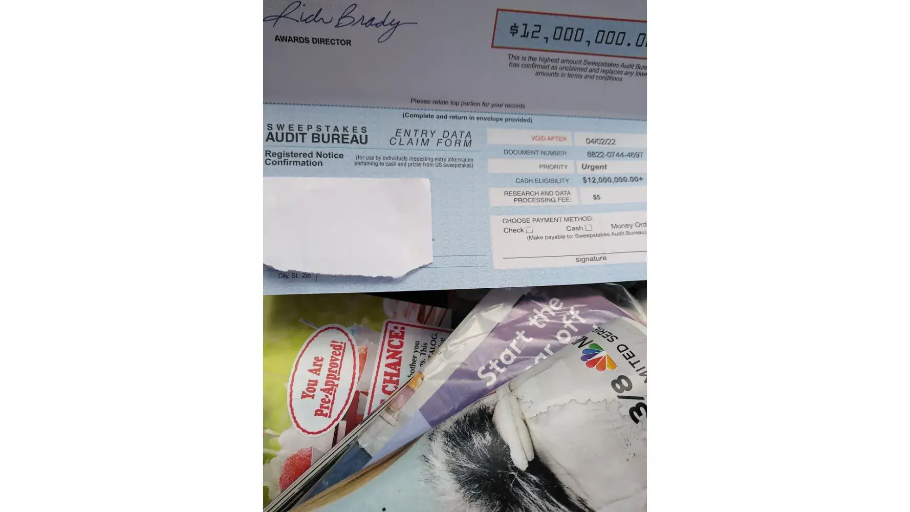 The Company is asking me to pay $5 to process my winnings of $12,000,000.00+ guaranteed. At the top of the letter addressed to me looks like a check written to me and in that area it states Personal and confidential. The letter from the awards Director Rich Brady, Sweepstakes Entry Data Center, P.O. Box 54912, Dallas, TX 75354. NOTICE: prize report funds remain unclaimed, Document # [protected]. Void After 3/19/22. Priority: Urgent. On the back of the letter it has Sweepstakes prize report terms and conditions.