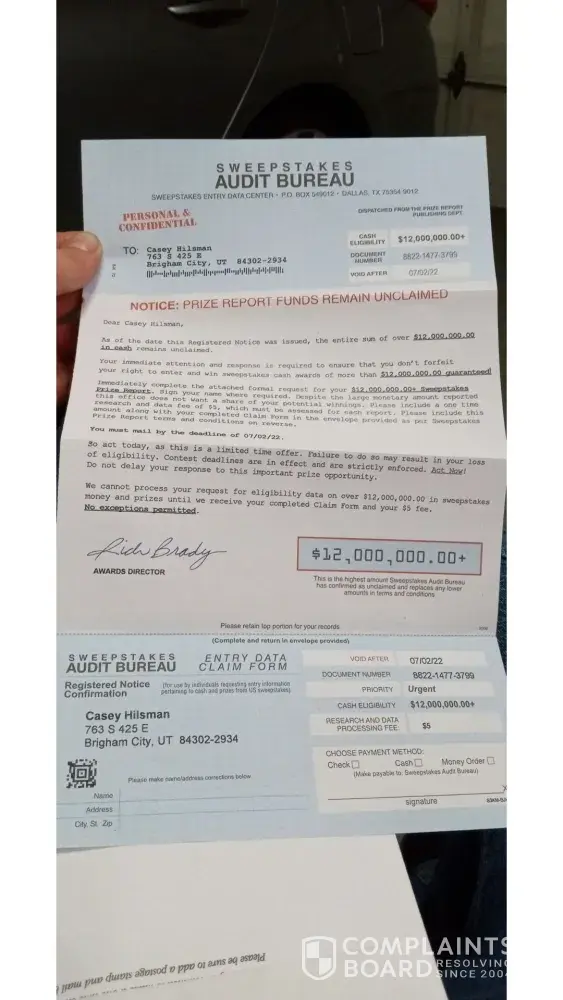 I just received the "exact" same letter.. The Sweepstakes Audit Bureau " in Dallas Texas. They apparently aren't very worried by any wrong they are doing cause my letter reads identical to the ones I see here. I decided to research this company before getting my hopes up. I see I was right. The only thing different on my letter is the document number [protected] VOID after date 04/02/22. Everything else is the same signed by Rich Brady. I suppose he isn't real.