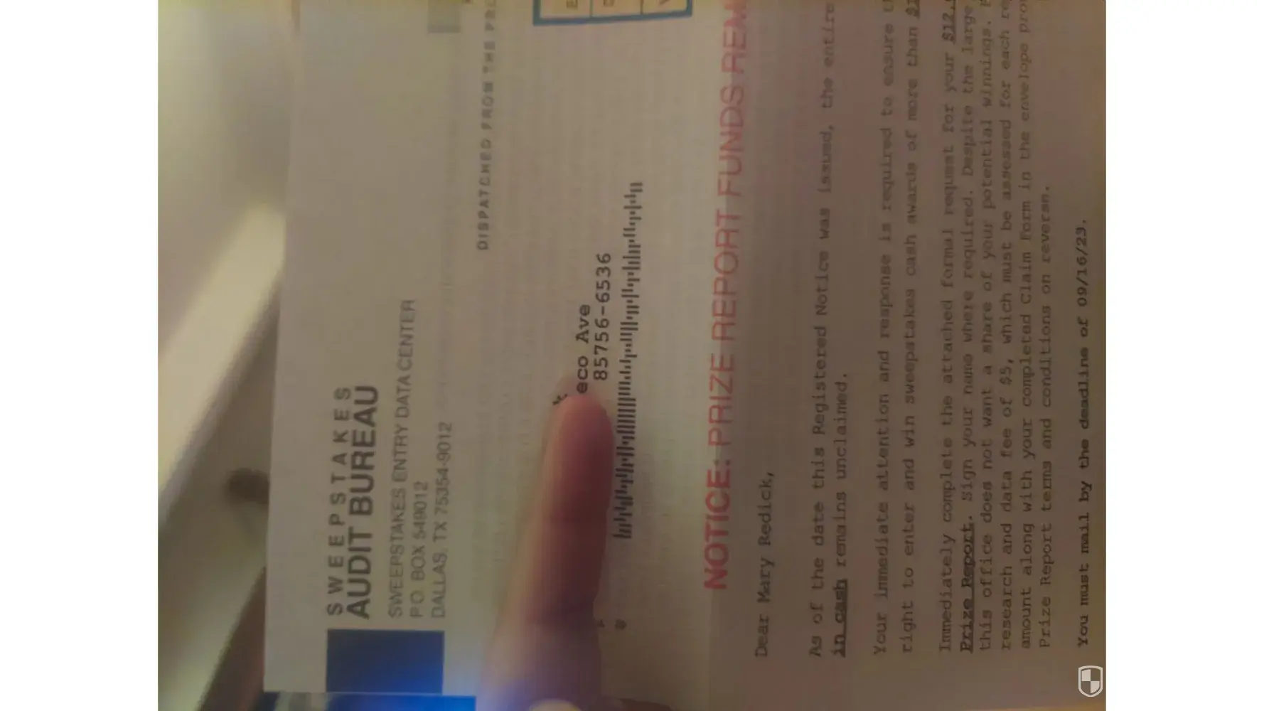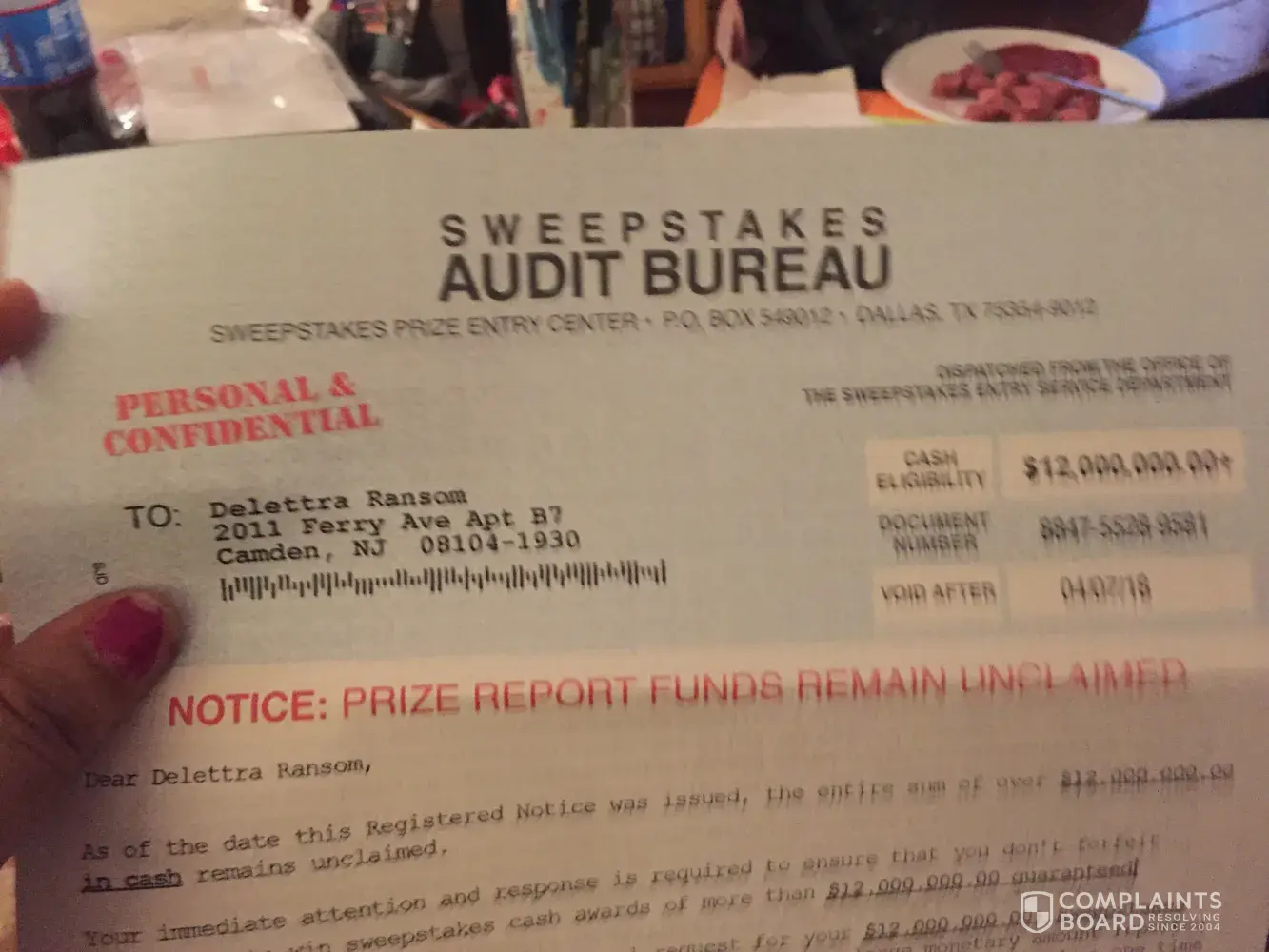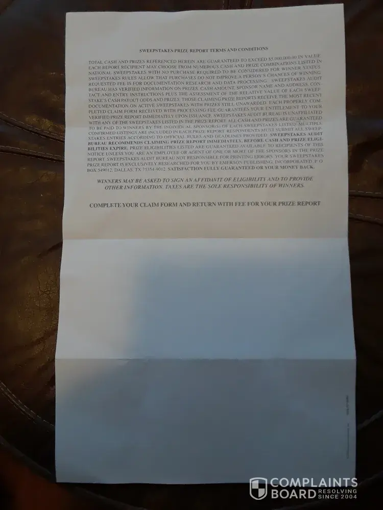 I ALSO RECD second NOTICE REQ ANOTHER $5.00 THEN CAME TO THIS PAGE. they don't check to they sent too already. NOT GOING TO MAKE SAME MISTAKE twice, WISH i HAD Recd second Notification from Sweepstakes Audit Bureau with Mail In Address of PO Box 549012 Dallas Texas 75354.RINTER ATTACHED TO THIS CPU i would print and send too. Did send ltr to BBB,