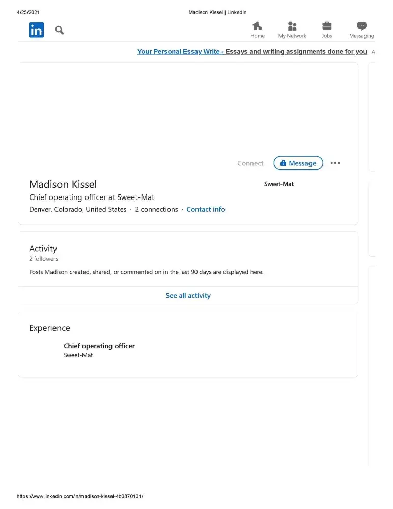 Madison Kissel, real estate agent in Denver, stole thousands of dollars and misused company bank card (bought a big screen tv that was never used for the companyis business and got away with it by lying to the police-the tv was later posted a few months later online for $2, 500 and sold) from a Colorado business in 2015. She helped steal money for a conman as his personal secretary and COO for his company. The conman has been charged with theft, ID theft and check fraud and the people running Sweet Mat also stole $10, 000 from a church serving the homeless and charged a credit card without the owner's permission.