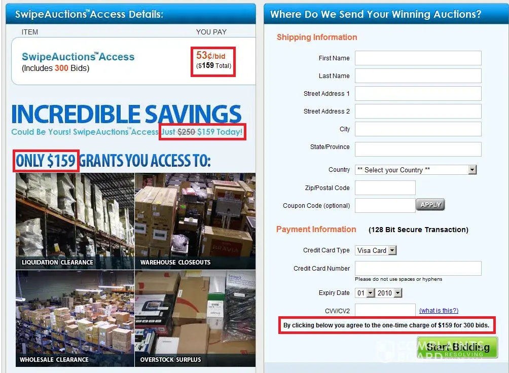 I am very frustrated and feel the need of complaining against this site, as a fervent internet user of sites like BIDZ, EBAY, OZSALE ETC.. I notice and add on my facebook page and decided to give it a try, as some have stated here the process to join is no were as clear as they are trying to say and is very misleading even on the right top was a link that says no thanks and thats the one I did touch i didn't accept the button on the bottom, but still they said welcome to swipeauctions you can now start to bid at that point I didn't realise they have charge me 159 dollars, and I WRONGLY TOUGHT I was just biding to see who was going to win and then pay for it as every other sites do, the biding was 5 fix bids at a time for a macbook computer in a matter of minutes they was a pup up window telling me you have no more credits to bid I was tooooo in the biding i accept the window not realising i was buying to bid, well for my SHOCK my card was charge with 495 more dollars, well straight a way I write to the live chat and they told me that they can refund the joining fee but not the bids packet that I bought I told them I didnt even buy no packet and I wasnt happy with the way they SCAM MY MONEY, how cant it be possible that these people even sleep at night knowing that the THIEF INNOCENT PEOPLE MONEY in such a low dirty way and think is OK. for me to win that mac Im sure i would have to buy more and more credits and in the end it would have been cheaper to go to Mac store and buy it, so much good testimonials on there site YEA YEA YEA, I really think something must be done to CLOSED SITE LIKE THIS FROM THE NET.