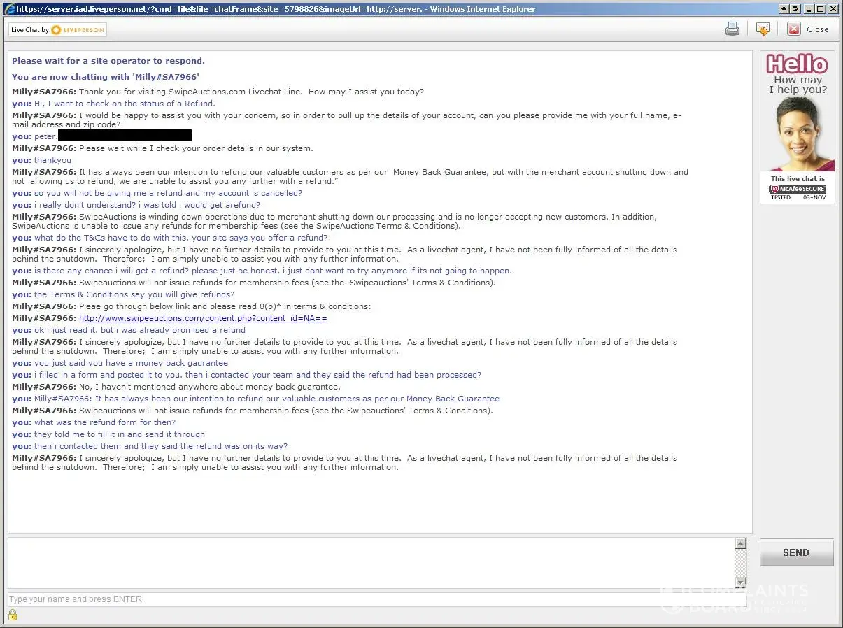 “Verlie#SA9298: Swipeauctions is winding down operations due to merchant shutting down our processing and is no longer accepting new customers. In addition, Swipeauctions will not issue refunds for membership fees (see the Swipeauctions' Terms & Conditions). It has always been our intention to refund our valuable customers as per our Money Back Guarantee, but with the merchant account shutting down and not allowing us to refund, we are unable to assist you any further with a refund.”