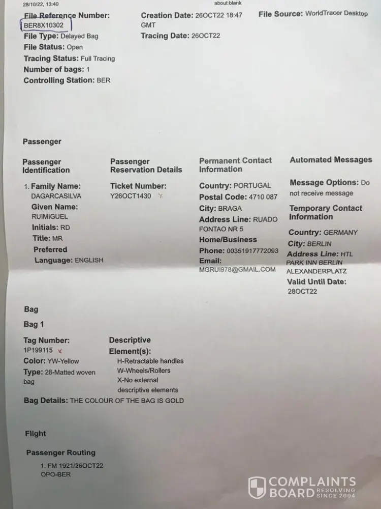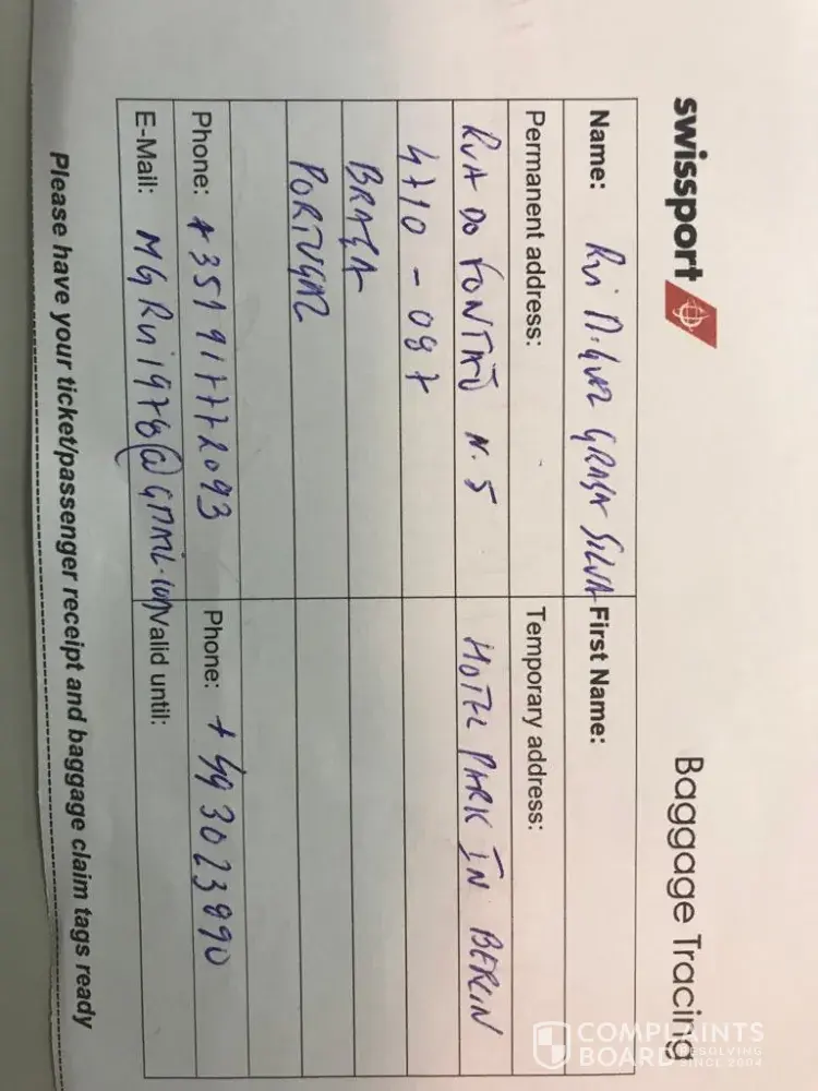 Last Wednesday, 26th October 2022, on a Hi Fly charter flight from Porto to Berlin, which took the SC Braga team to the German capital for the match against Union Berlin, my luggage did not arrive at its destination. I spent about an hour and a half at the airport, going from counter to counter to complain about the loss of my luggage, since Swissport itself told me that it was not up to your esteemed institution. After this time, the Swissport staff confirmed that it would be with your institution.
