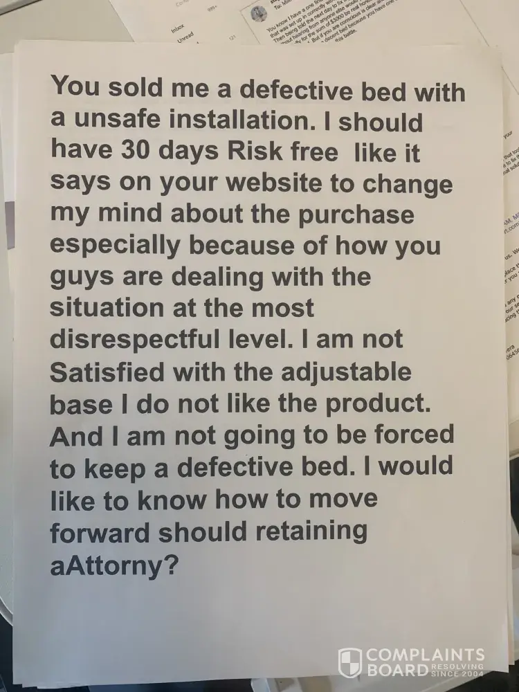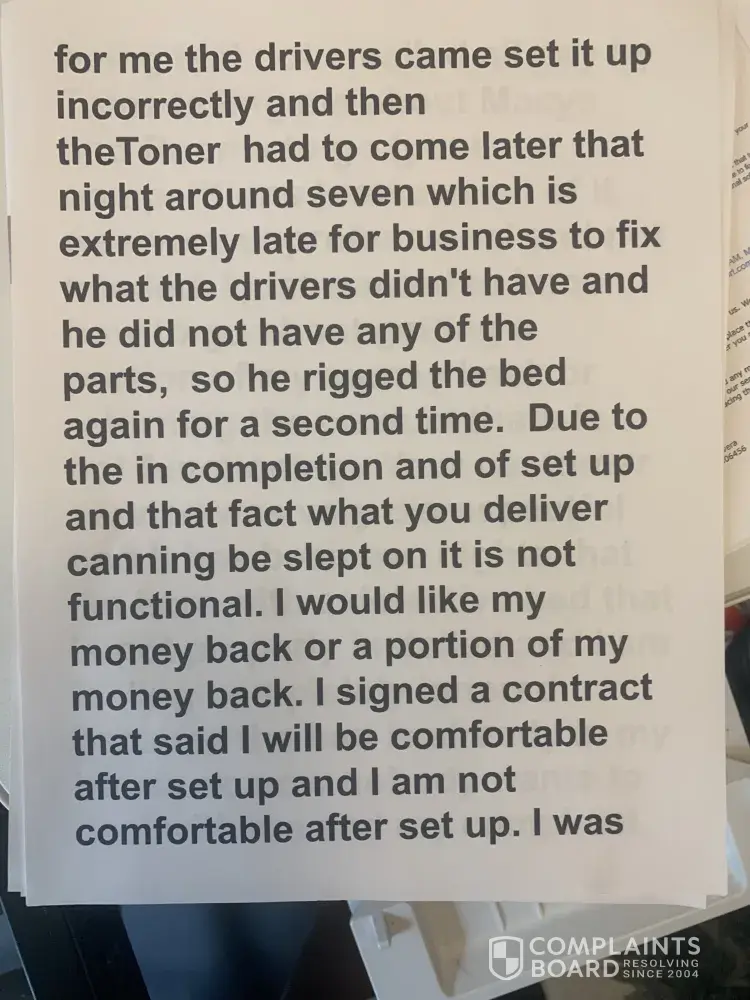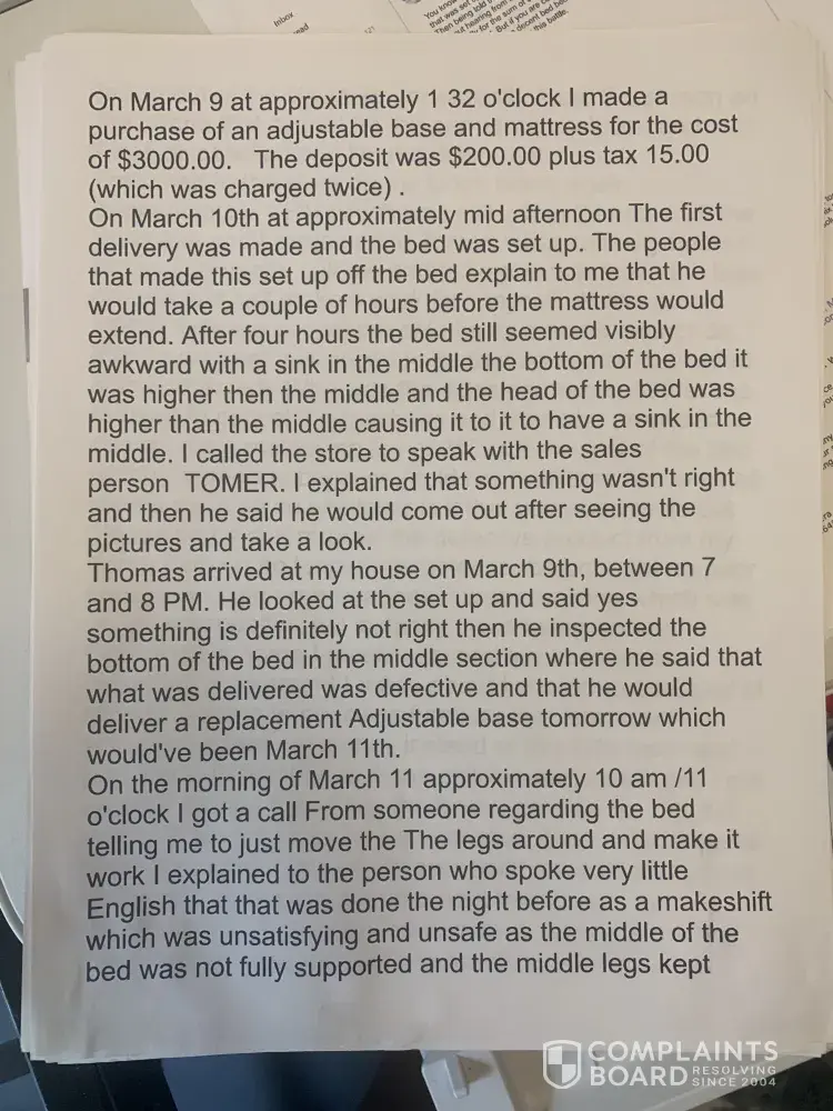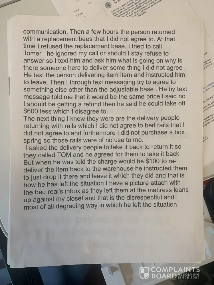 The merchant breached their contract; he took the adjustable base bed back and left me with bed rails - which is not what I purchased- he has ignored all communication to resolve this issue from March, 2021