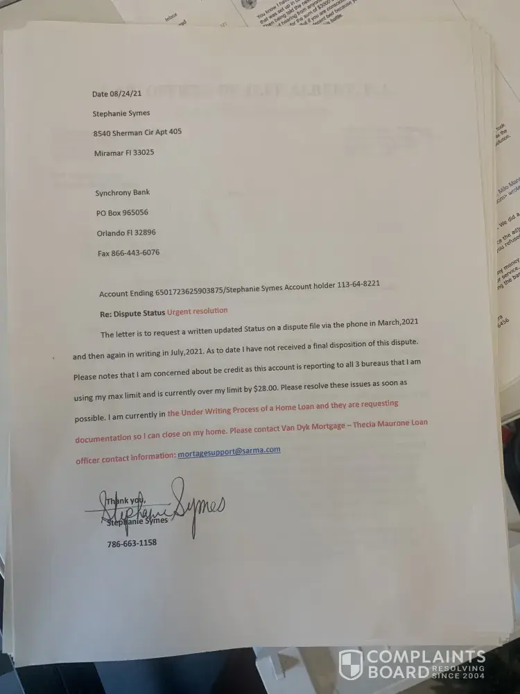 I have a dispute that is open and has been open since March, 2021 and I have not heard or receive any correspondence as to a resolution. The merchant is charging me $2800 for something that I don't have he never delivered a proper bed. He delivered a product that was defective and had an issue to replace it this was considered a breach of contract and I asked him to please terminate my contract and refund me my money's Wells Fargo refunded me my deposit and I'm asking s synchrony bank; To do the same and not paid the merchant this 2800 because I do not have a bed which is what I purchased an adjustable base bad as for the mattress he refuse to take it back and my attorney has written two letters asking him to collect his property which he has ignored. This is why we are in dispute because that's how he has dealt with me since day one was the ignore me ignore my concerns ignore the fact that the bed was defective the supporting metal pieces on the bed were missing causing the bed to sink adjustable base bed it was not properly supported because of missing and defective pieces the merchant has ignored me and continue to ignore me he had some guys deliver to bed rails no boxspring and even then that is not what I ordered and that is not what I should be paid be paying for please resolve this issue as I am in a closing and need this resolved ASAP for the underwriting department or a letter stating the status of my account the true status.