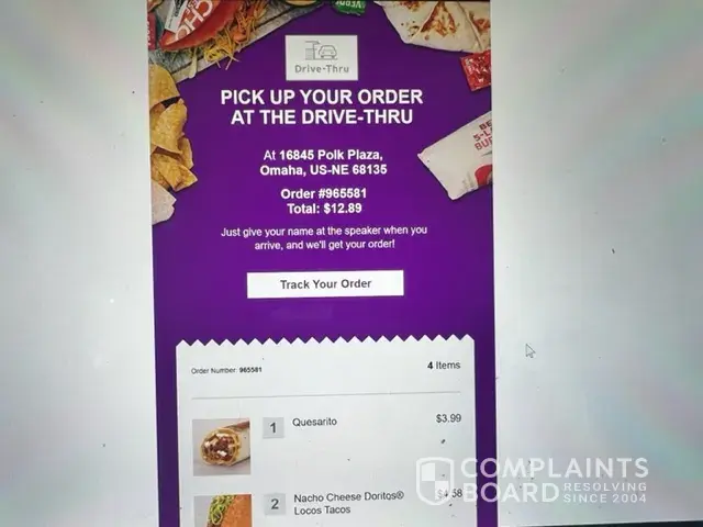 Below is an order placed by someone who hacked your app and my account with tacobell. They are ordering food and have been on numerous occasions from another state, this is from omaha and I live in maryland. I need this account shut down and reimbursed for the items this person is buying that I am being charged for. I need a corporate executive to contact me and discuss how this is being handled amongst other things such as service and mis orders in your stores. Luckily I saw this e-mail saying my order was ready that grabbed my attention... I thought at first the e-mail was a response to the one I sent after once again being shorted food in your drive thru. (6 tacos).. This is a very serious matter and hopefully this person does not have my credit card info. This person has made multiple purchases from the same location