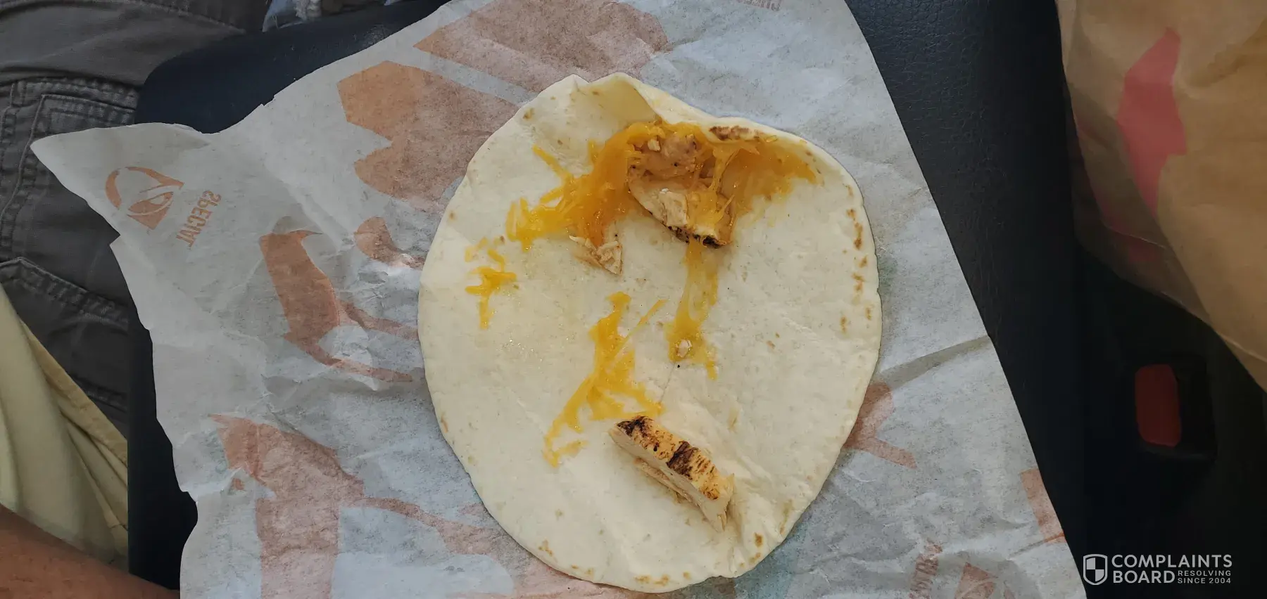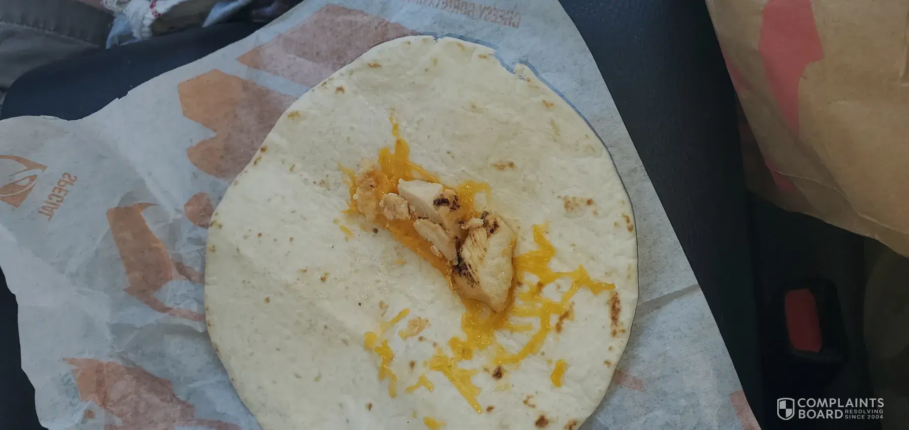 My order came folded in half, like a ball, with the chicken and cheese oozing out of the quesadilla. The wrapper was a piece of paper folded over the whole mess, but not covering my food. In fact neither item in the bag was wrapped properly and the manager said that's the way it comes now. I asked him if they serve to go orders unwrapped. "Yes" said the...