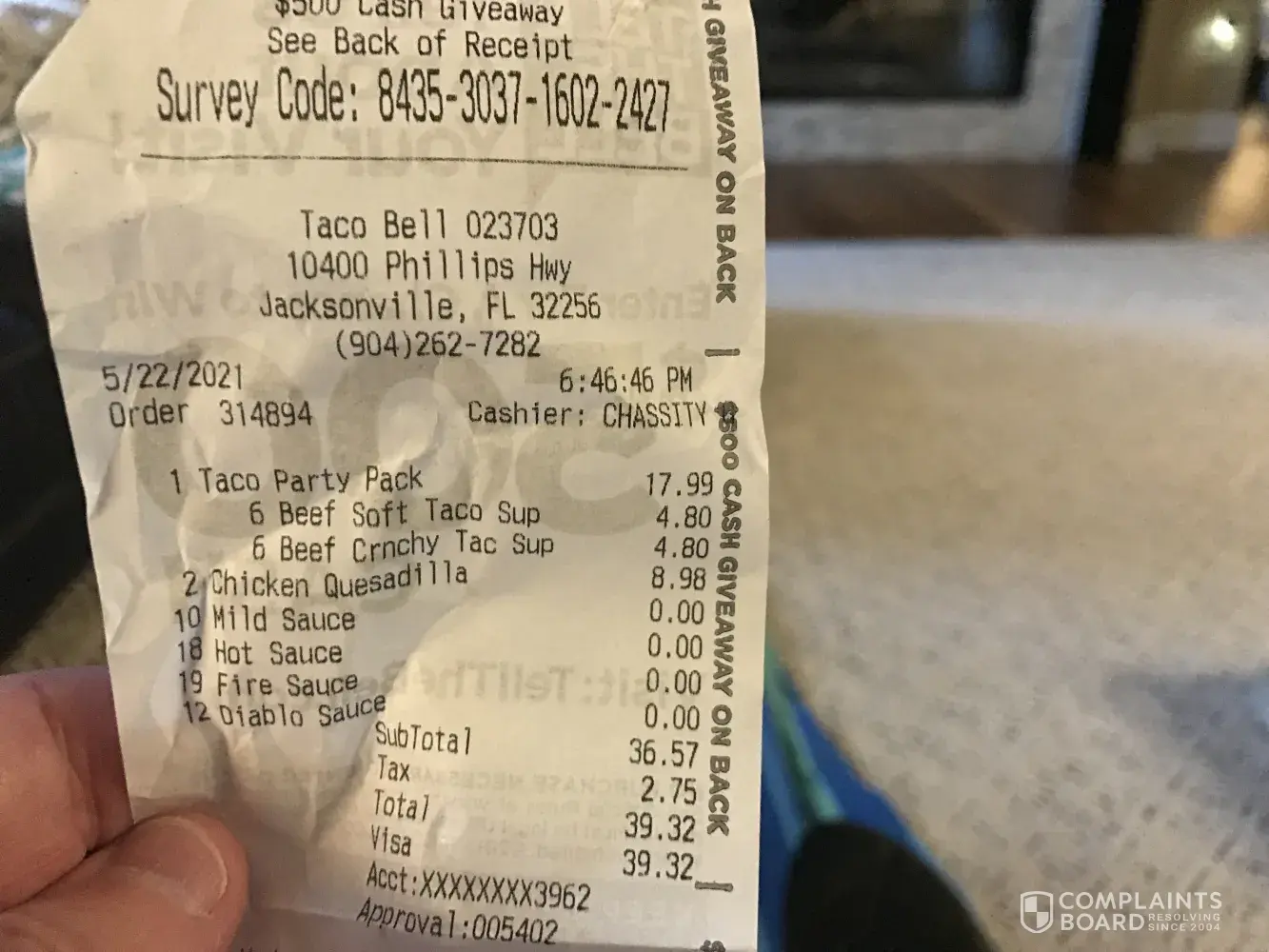 I ordered a taco party pack and 2 chicken quesadillas. I asked for a mix of sauces and on my receipt, it even lists multiple sauces, but when I got home, no sauces in either of the 2 bags. Spent $39.32 and got no sauces. It's happened before but damn, if I'm spending that much money, the Bell should be making sure to include everything. Also, the associate...