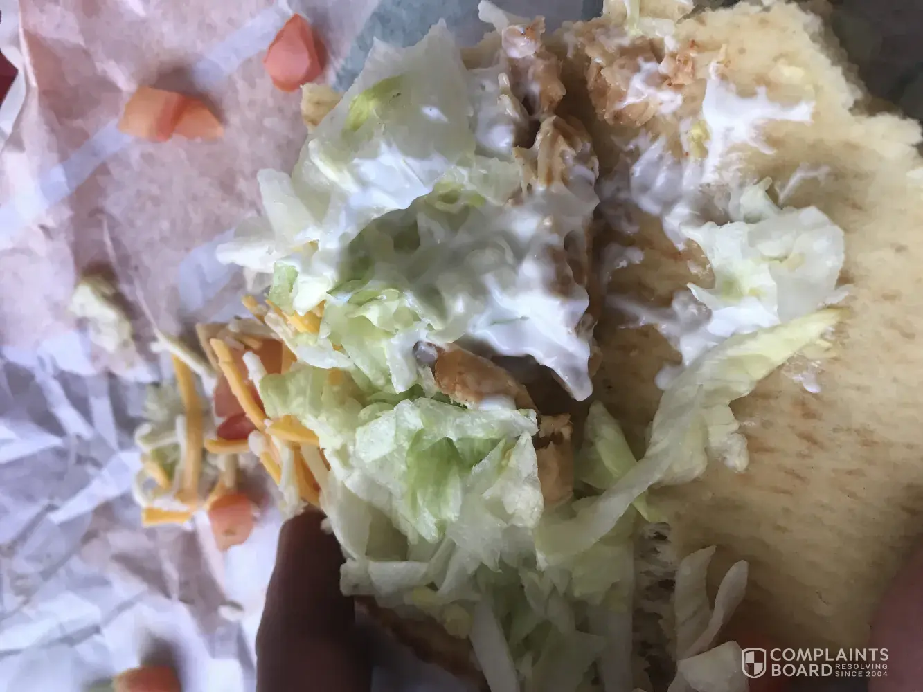 The girl at the counter spilled my soda all over the place after getting me the wrong soda and then lied to me about wiping the cup down I got soda in my new Escalade and then when I got home about three minutes later the Chalupa's were very very cold and there was about a teaspoon of chicken if that into each one and I spent 20 bucks to buy four of these