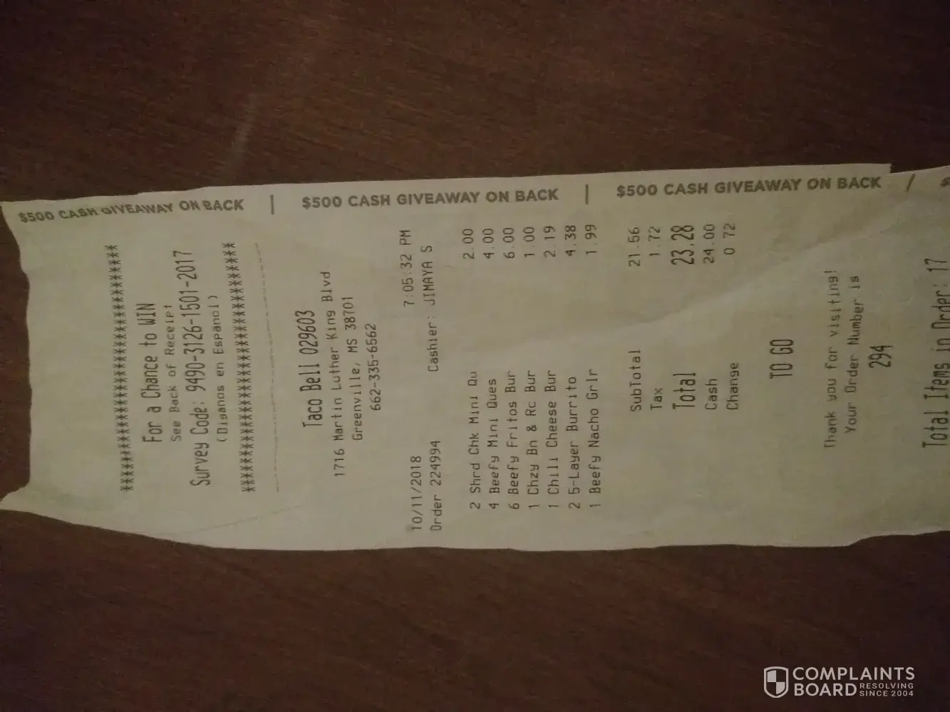 My husband and i went to taco bell on 10/11/2018 in Greenville Ms order # 029603 @ 7:05pm.