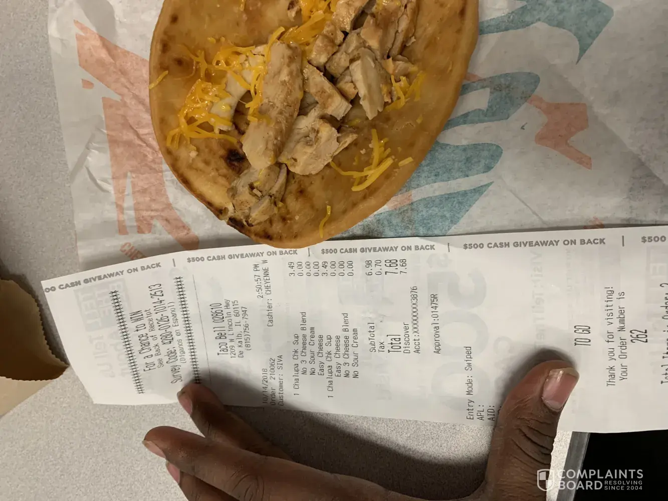 Every time I order a chicken chalupa I ask them to replace the triple cheese with cheddar cheese and ‘no sour cream', as I am lactose intolerant . Until now, I used to order a ‘to go' and as soon as I reach my home to open the food, I see only triple cheese and chicken in my chicken chalupas, and nothing else (no tomato's and no lettuce). When I order a dine in I get everything I want. But, when I order a to go, I get fooled by the employees. I'm a lactose intolerant person and I can eat only cheddar cheese so I ask for it. Why the hell do they mess with my stomach when I'm paying for my food? This has happened more than 4 times to me now. I'm fed up of it. Why do I have to pay 7.68$ every time I ask for a chalupa and I get nothing except for cheese and chicken in my chalupa. Once, I only got cheese and no chicken in my chalupa. What the hell is wrong with those guys? Today October 14, 2018 I ordered a to go for ‘two chicken chalupas, no triple cheese and no sour cream and asked them to replace the triple cheese with cheddar cheese'. Well, as soon as I reached my place to open it, I got the chicken chalupa with chicken and cheddar cheese all right but I didn't get either tomatos or lettuce in my chalupas. I took pictures of this . One of my chalupas had very little cheddar cheese and chicken with nothing else in it, while the other had tomato's and less chicken with cheddar cheese. My point of complaining today is I'm fed up with taco bell fooling me every time I order a to go. I don't want to pay 7.68$ when I get food that's not even worth 3$. I don't care anymore. I didn't even post negative reviews on taco bell or any other food chain company until now. I hope you understand my frustration.