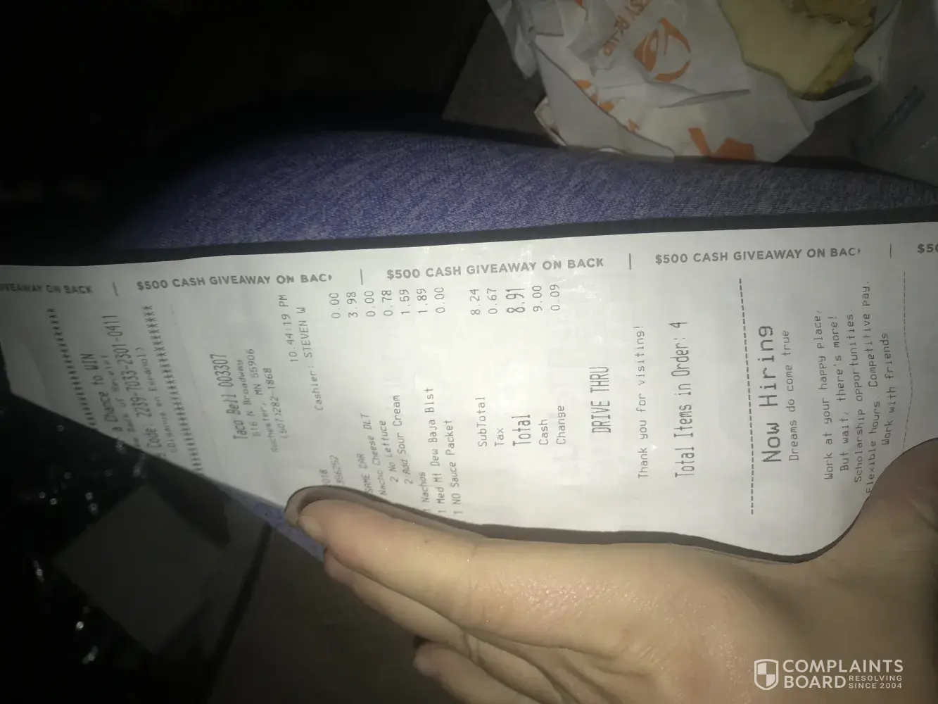Yes my name is sean and I do postmates and I was picking up my food throught the drive thru. I asked for a seprate order amd he couldn't do it. So I ordered anyway. I got to the window as soon as I got the food. I asked for a receipt and was refused. I asked to speak with a manager and he said I am the manager. I had to cancel my Call and call the customer back to tell him I couldn't deliver. The customer was very upset. I have never had no problems with taco bell till I went to this taco bell. It's on 2904 Gallatin pike