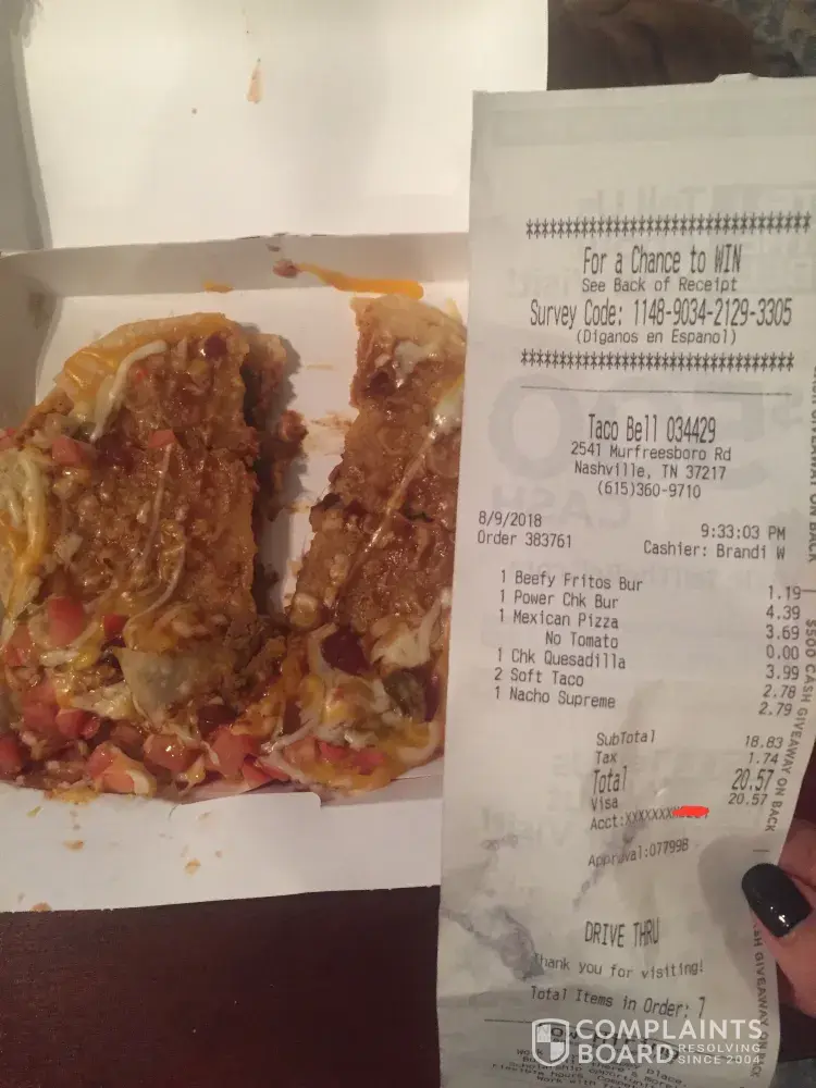 On 8-9-2018, I went through the drive-thru at Taco Bell. I had ordered one mexican pizza without tomato, which is stated on the receipt. However, when I got home the mexican pizza had tomatoes! Also, when I asked Brandi W. for "a lot" of mild sauce, she gave me 2. I had ordered a total of 7 items and she gave me 2! Does that sound reasonable? Not at all. She was rude as well. Overall experience, this Taco Bell has horrible service.
