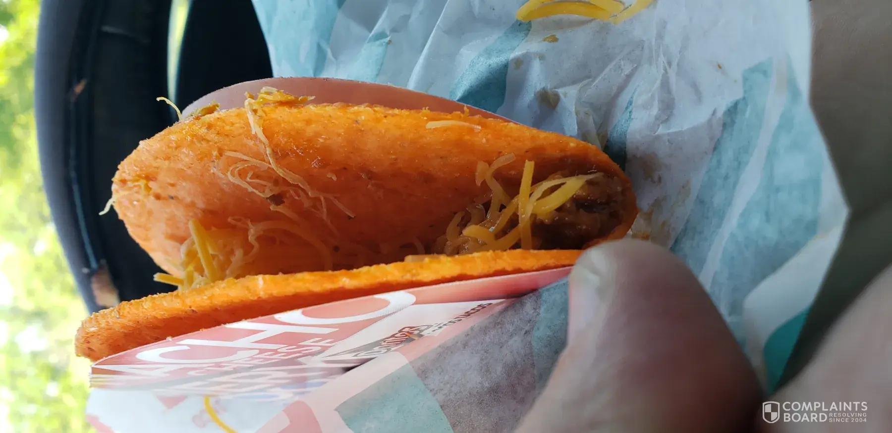 As soon as removed from foil. It spilled all over my business clothes. Dripping with sauce and grease. I managed to get water from the front counter and a rag. Horrible wrapped. No care involved ... Taco Bell 033461 8:23 pm. Balboa blvd. 2121 ... longnlines. They just threw the food together . The guy who had a bag in his hands only had one glove on ... never changed it ! Gross ...