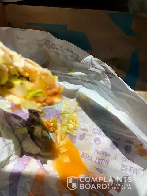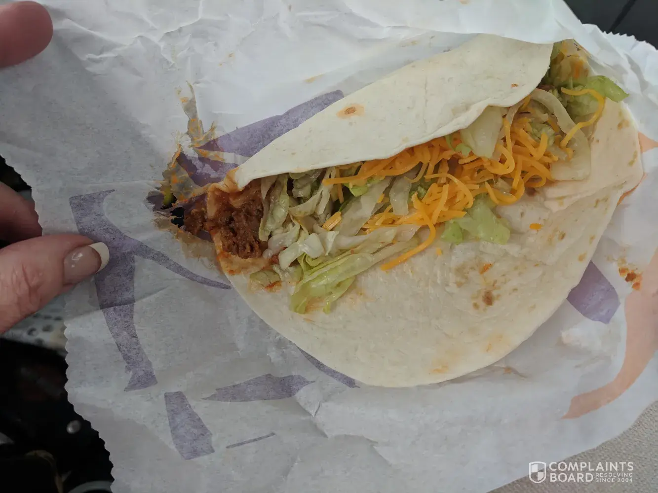 I purchased 2 soft taco supreme tacos with no cheese at the drive through on 5/13/18 at 1:38 p.m. Upon opening both tacos, water spilled out of them, they contained pieces of cheese (as if they had originally contained cheese and it had been picked out), and neither contained sour cream. Because of the excess liquid pouring from the tacos, the tortilla shells were soggy and slimy. I would like a refund in the amount of $4.13 or a voucher in the amount of $5 to make up for this terrible experience.
