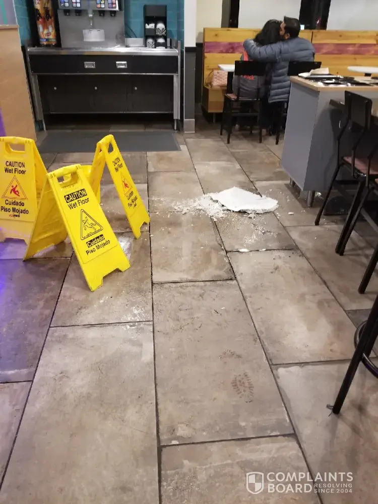 San Jose, CA 95128. I went to get some sauces when all of a sudden the ceiling tile cane off the roof. I realized that there was a leak & the tile became wet that ma why it fell off. If I was a little closer to where it fell I could have seriously gotten injured. Thank god there wasn't a kid because then he/she could have gotten a worst injury than me. Probably could have even slipped, they could at least clean up the mess instead of just leaving it a mess. Taco Bell fix your [censor] and prevent another [censor] accident like this.