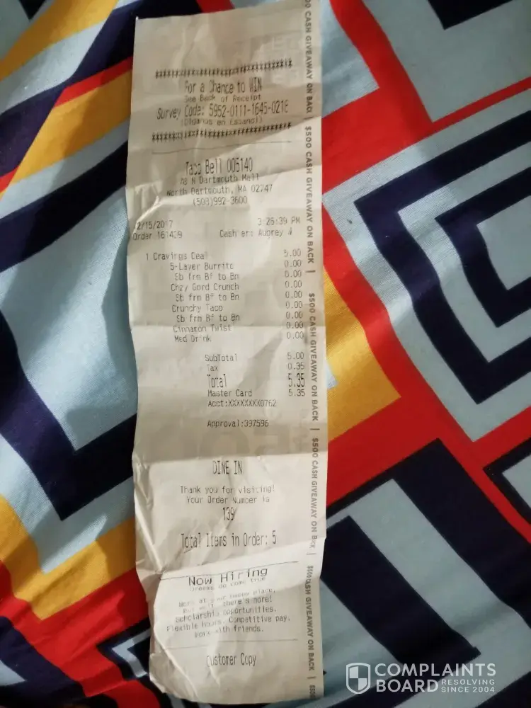 First of all I bought the big box with the chalupa 5 layer burrito taco and twists shown on screen I ended up with chalupa that was stale and no taco or twists the 5 layer burrito was beans beans and more damn beans..we ordered extra meat what did we get half a scoop of meat period it didn't even cover his nacho Bell Grande and the taco that came with it didn't come with it.. Oh we asked for mild and fire we got hot and Diablo.. What a great resturant never will I ever ear there again $15 spent and wasted