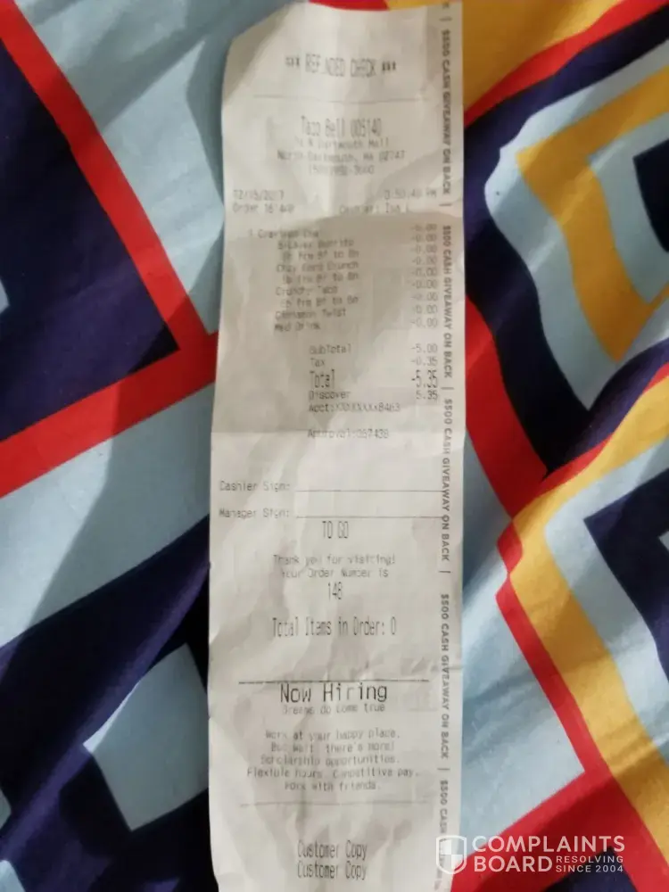 I went to Taco Bell today, 12/16/2017 to get some lunch. Went through the drive thru, the cashier got my order wrong on the screen and I tried to correct her. Pulled up to the window and asked her if she corrected it. With a rude attitude she said "yeah I got it". I got home with my food and it was still wrong. It looked like had just thrown it all together without any care. I ordered a taco and it was soggy and cold. My entire order was cold, like it had been sitting out for the last couple hours. I was to tired and did not want to waste my gas going to Taco Bell for them to fix a mistake they made. Store Number: 029144 Order Number: 343660 Cashier Name: Daira B