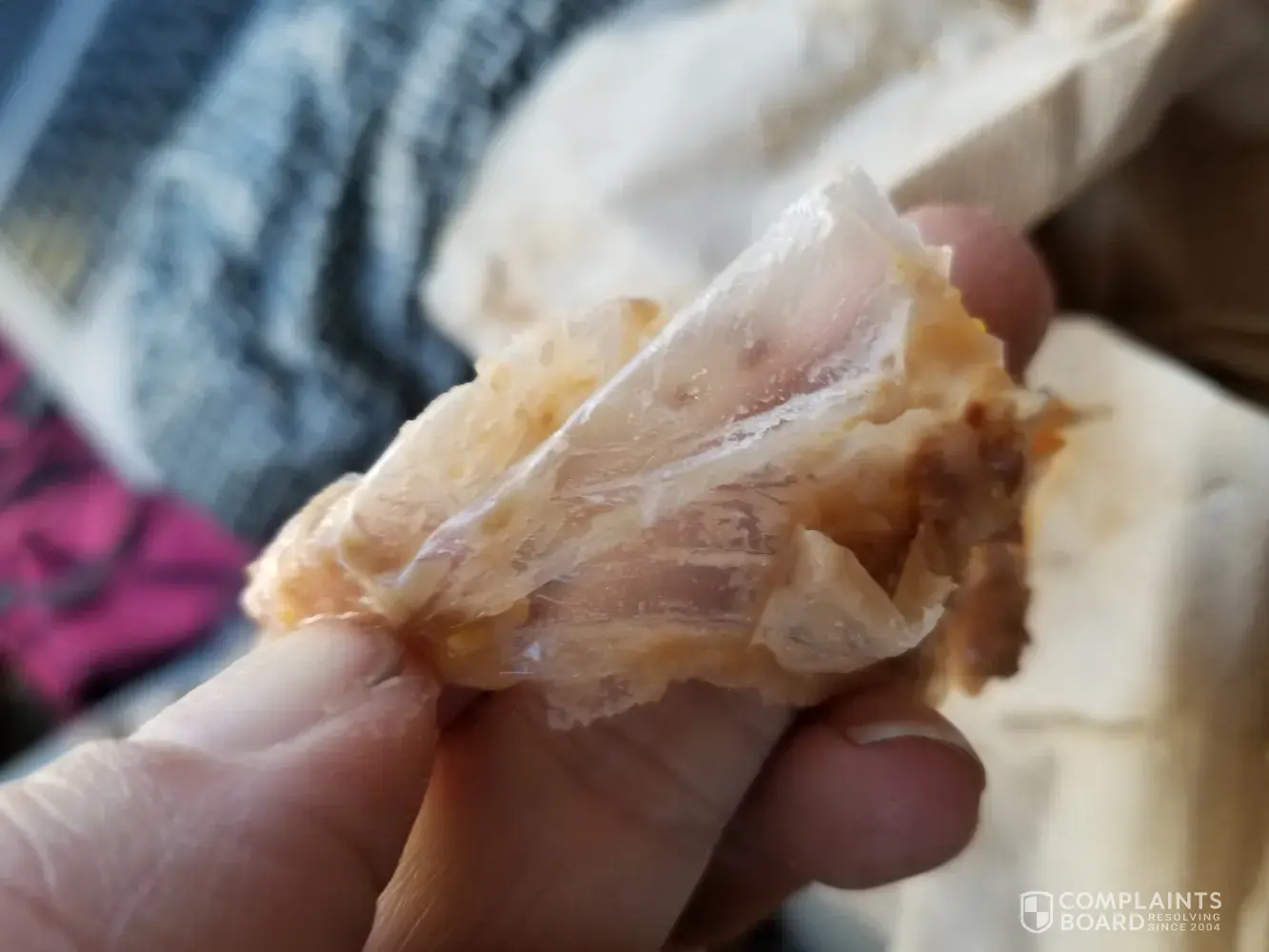 I went into the drive thru got two bean burritos. After a few bites I started to choke. I put my fingers in my mouth and pulled out a 5 inch piece plastic. I couldn't believe it. It was disgusting and could have killed me had I not been able to pull it out. I called the store multiple times to tell them. I was worried someone could be injured. Busy. BUSY. Called customer service and they closed as it was before 11. I called back made a complaint. I would like to forward the photos to someone or I'll post it on social media and warn anyone that goes to that location.