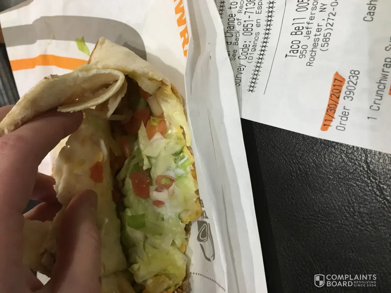 I went to a Taco Bell in Henrietta, NY tonight (11/30/17) on Jefferson Road and ordered a Crunch Wrap Supreme with NO tomatos. I was customer number 390238.