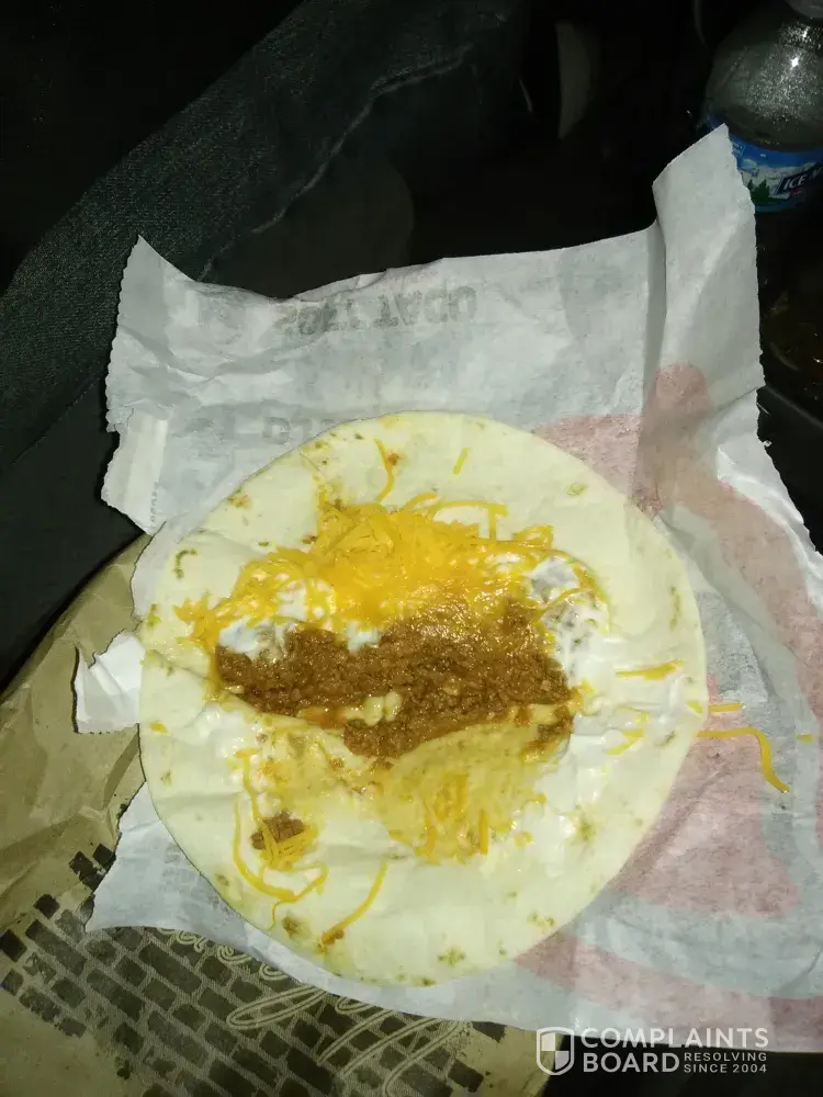 I had two parts of the order. Three crunchy tacos with no lettuce. They came with tomatoes, lettuce, and sour cream. My friend ordered a steak burrito and supreme taco. The burrito was ground beef. We waited 20 minutes in line for none of it to be right. One of the drinks was wrong too. We ordered a Pepsi and a Mountain Dew and got two Pepsi's. We didn't notice until we got out of the drive through.