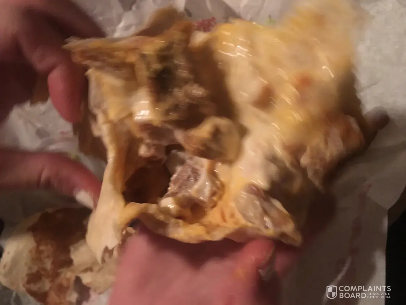 Is it possible that it was just a mistake in preparing the food? If you still have it, you should bring the food along with your receipt back to the location where you had purchased it. If you ate it, they most likely will not be able to refund you.