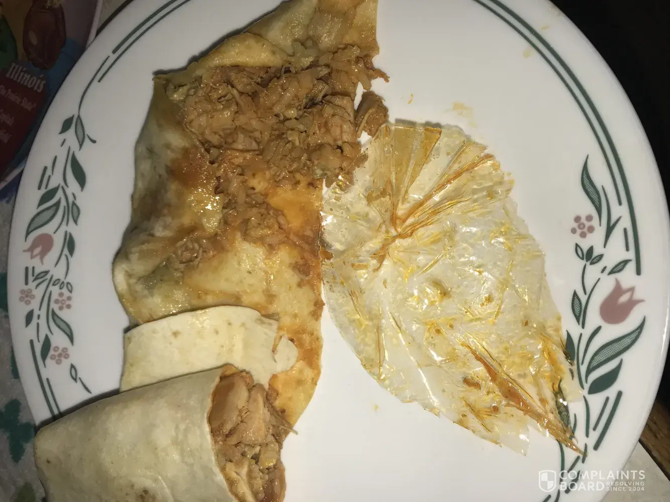 At approximately 12:30 pm on Thursday, September 21, 2017, we went through the taco bell drive thru located at 1818 Plainfield Rd, Crest Hill, 60403. One of the items I ordered was a chicken burrito. After getting home, I cut the burrito open to eat it & found a plastic wrapper inside. That is absolutely disgusting & unacceptable. I would like something to make up for this mishap.