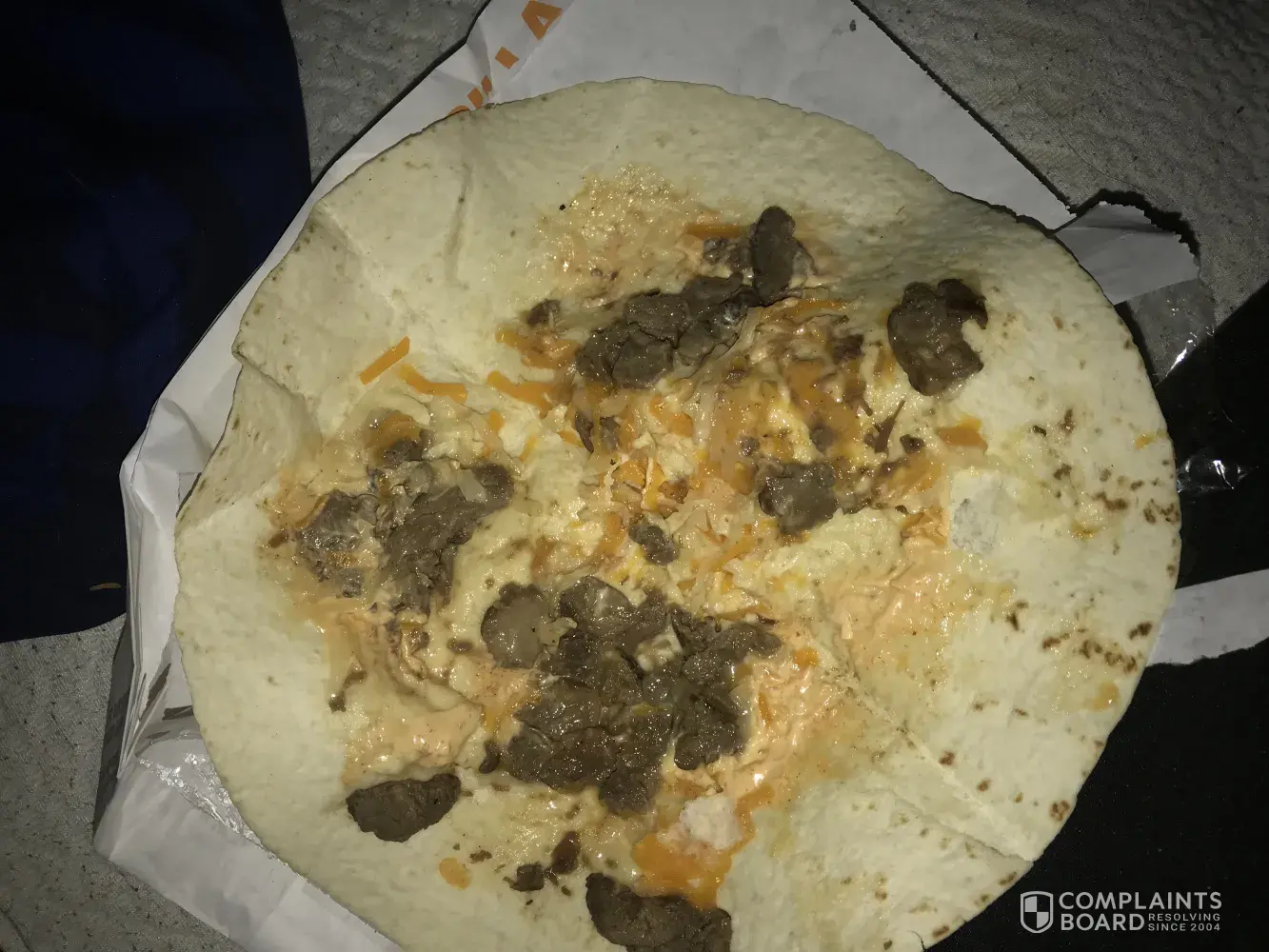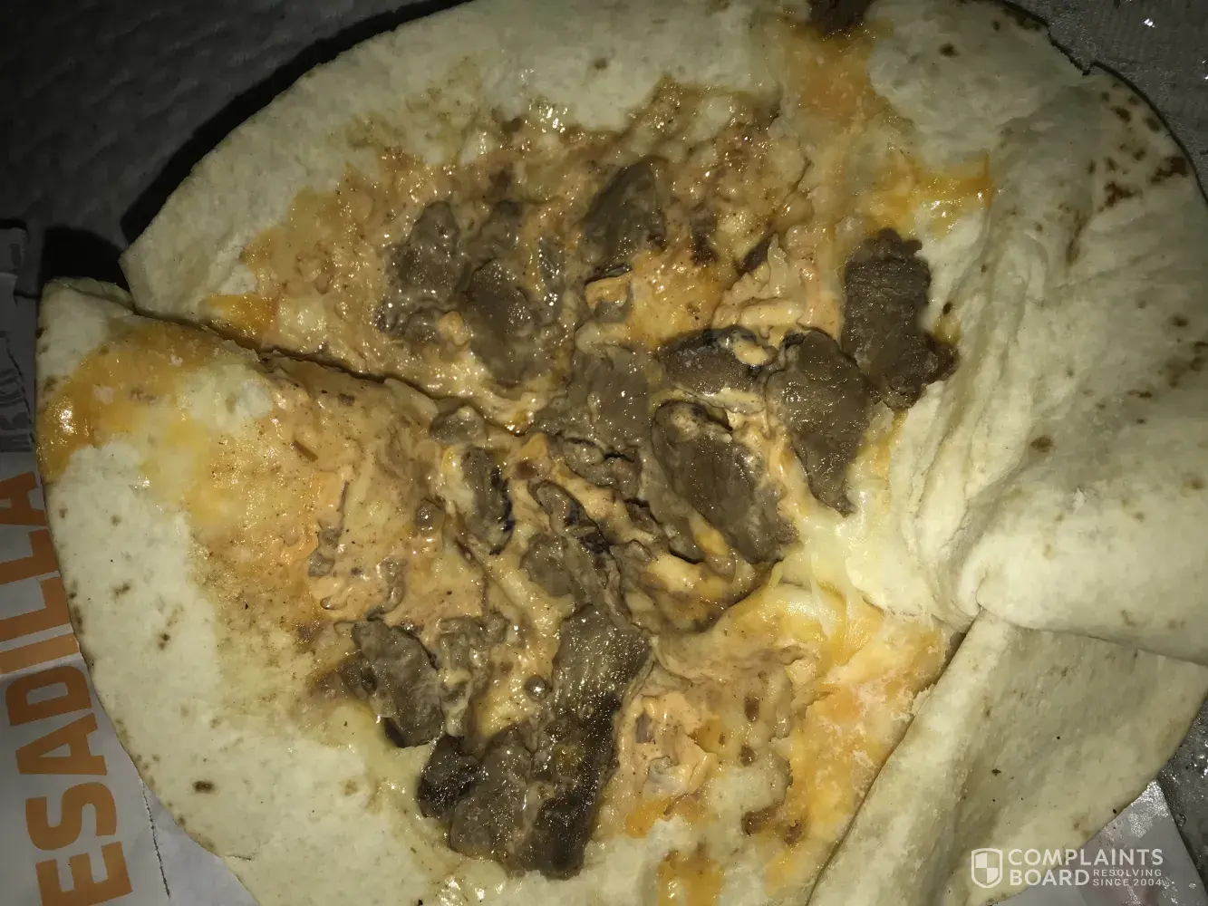 On Wednesday, 9-20-17, I went through the Taco Bell drive thru on my way to work. It was around 10:50pm. I ordered the #7 with a Pepsi, and an extra beefy mini quesadilla. Once I arrived at work, I ate the taco, then the first two pieces of the quesadilla. When I pulled the last two pieces apart, there was a hair. I was so disgusted I could not finish my meal. I was not given a receipt, but I would at least like a refund.
