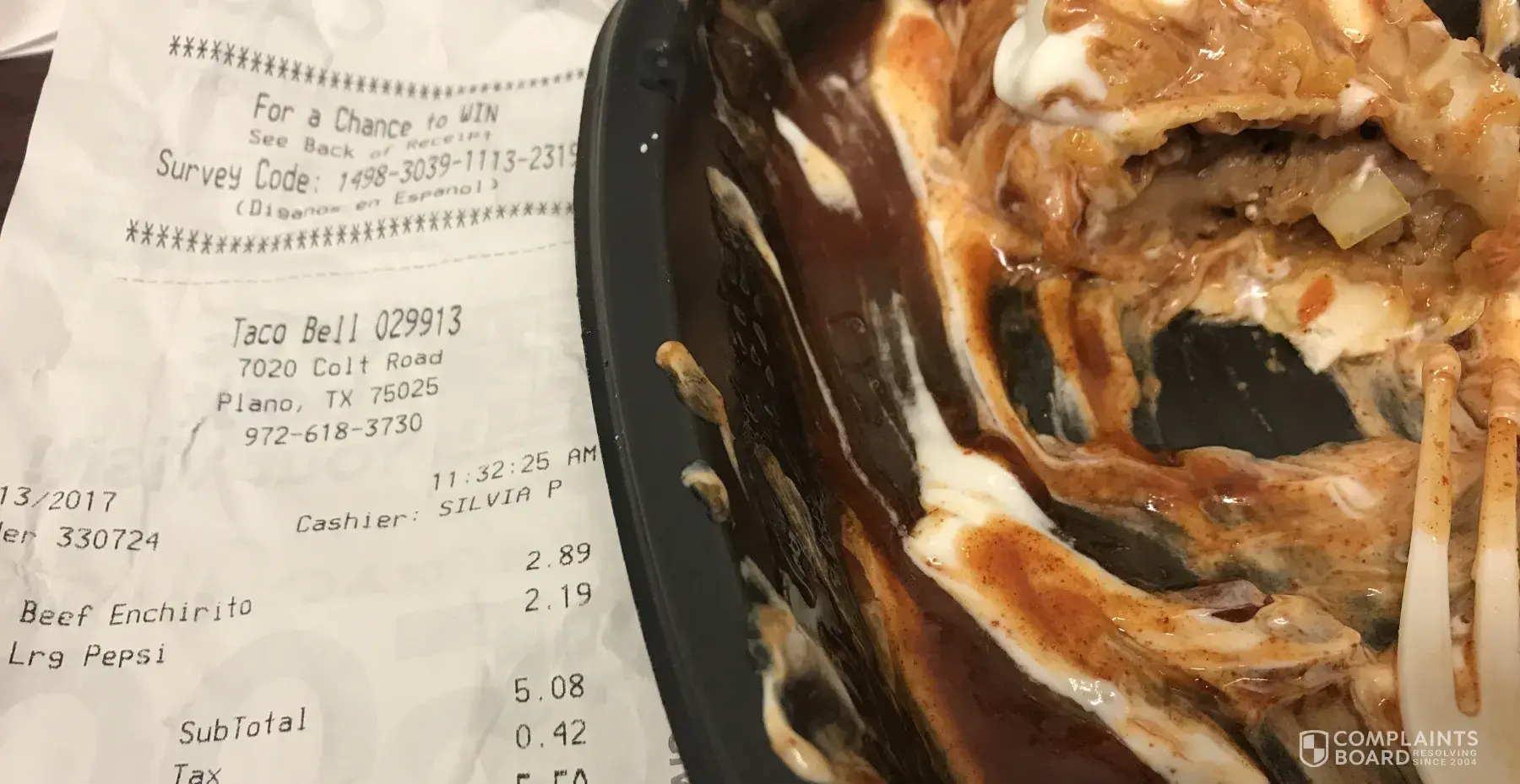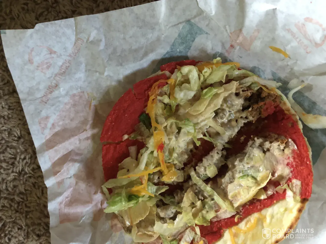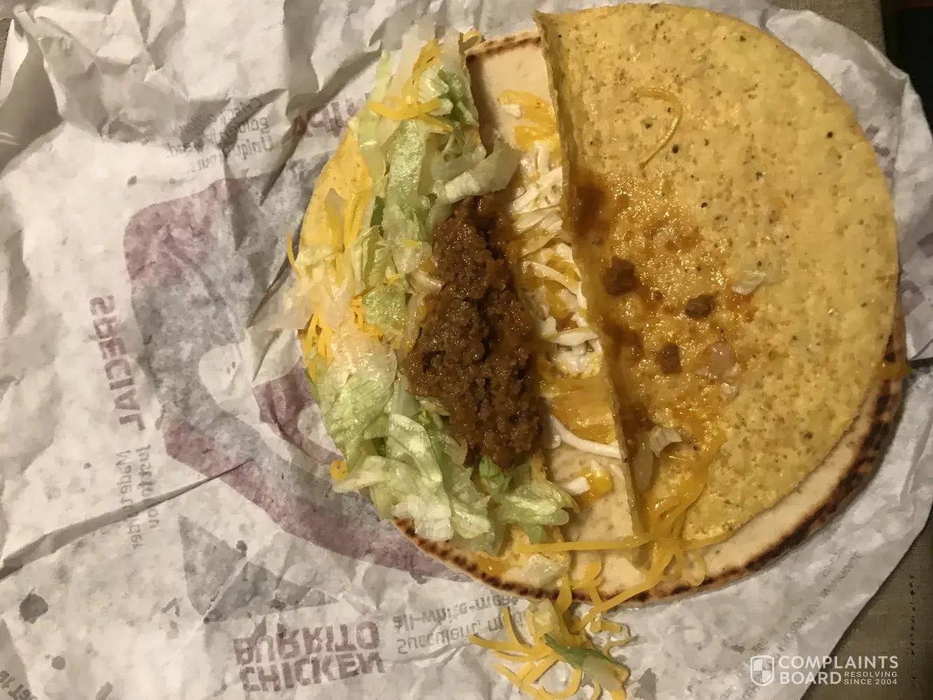 Ordered beef enchirito and received a bean enchirito, no beef at all. Didn't open it until I was at work and couldn't return to Taco Bell. Also could t get different food as I was unable to leave work for 9 hours. Had to eat it or go hungry.