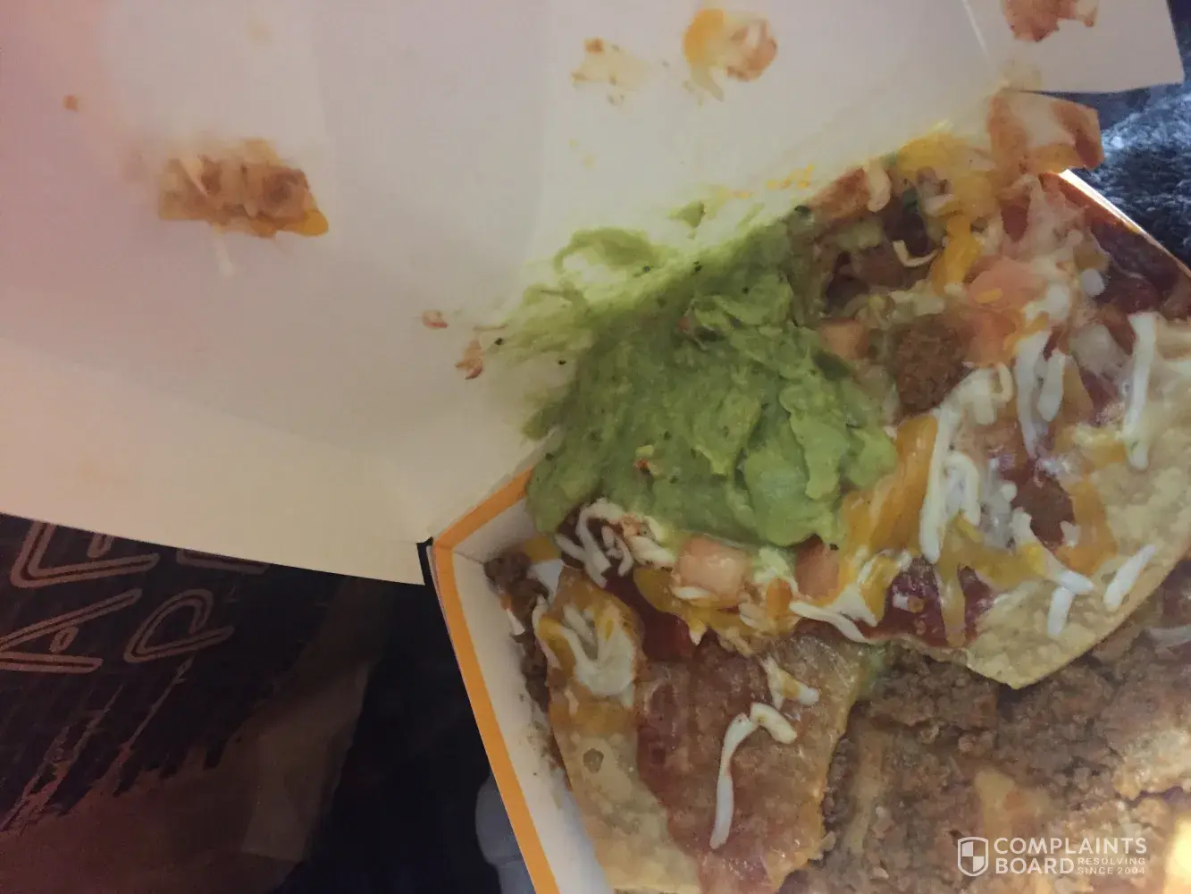 Every time I get a Mexican pizza, the top of box is always smashed don't on to the top of the pizza and all the cheese gets stuck to the top of the lid. Well this time I asked for extra cheese and I got this instead... there is always something wrong at this Taco Bell