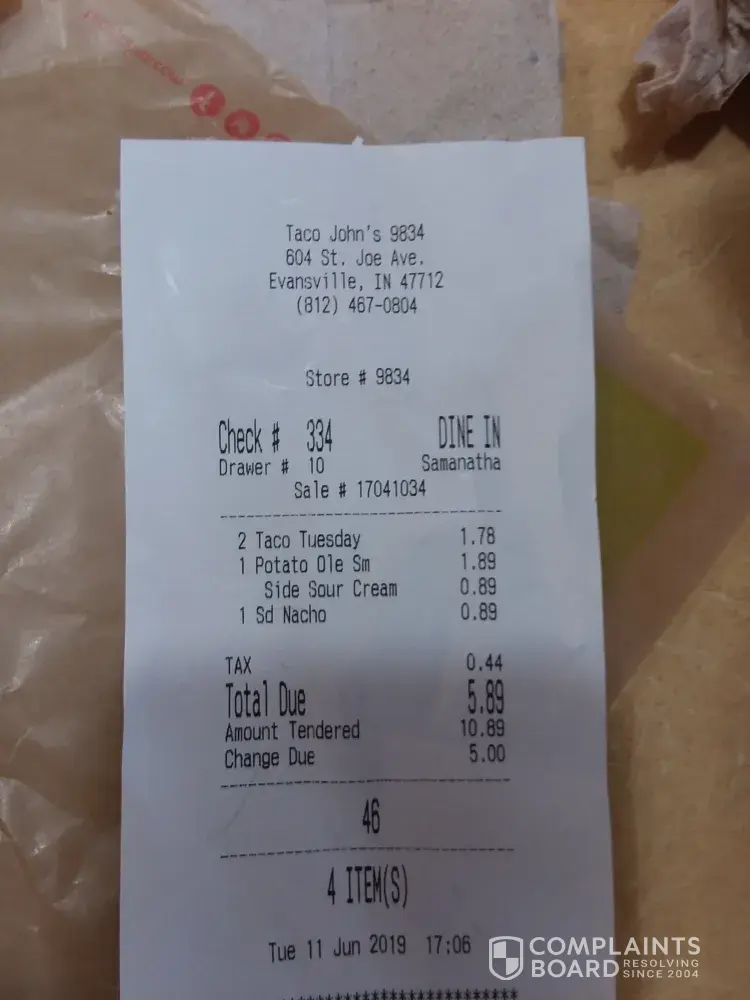 My 1st time to try taco John's on taco Tuesday. Was so very disappointed. I ordered 2 /.89 tacos and small potato ole. I specifically asked does the cheese come with so I also ordered a side of sour cream. I noticed my receipt charged me for cheese also. I asked why, they said we made mistake. The tacos were pittyfull. Taco bell for me. Not happy