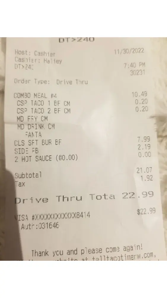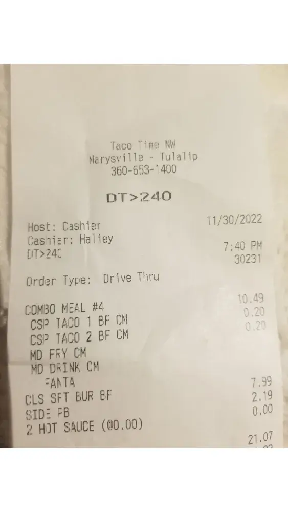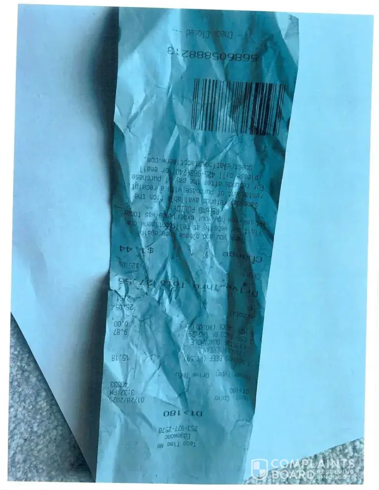 I went through Taco Bell yesterday and got a soft burrito and it crisp meat burrito and my crisp meat burrito was broken into. I have a picture of it. They charge you $4 for the stupid thing. It's burnt and it's broken too. I got this in Salem, Oregon. I live in Dallas, Oregon which is 30 miles away so I wasn't about to go back. But this is ridiculous and I can't believe they even think that. That's good service plus [censored] for sauce. Nothing was in the bag. They don't give you a receipt but I did take a picture. That was my crisp meat burrito. Yum huh? Jody Trusty 971.312.3947 [protected]@gmail.com