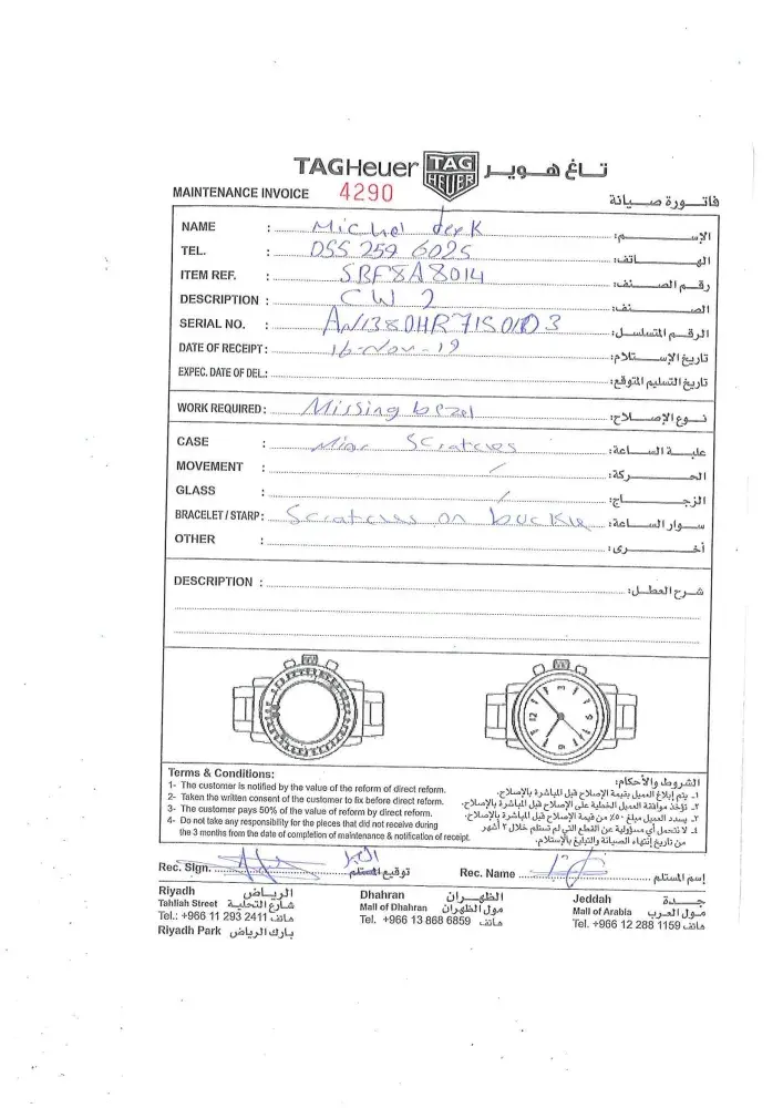 I bought my CW2 Item Ref SBF8A8014 serial number AN1380HR7150103 last year and suddenly, the bezel fell down due to manufacturer defect. I sent it to the TAG HEUER dealer in Riyadh KSA back in November 16, 2019 and UNTIL TODAY, 5 MONTHS LATER, the watch is not fixed yet. shouldn't you either grant me store credit for me to exchange the DEFECTED watch and get a watch that works or please inform me until when, I will keep waiting without a watch? is this customer satisfaction?