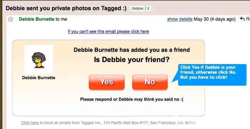 Our Real Estate agent in an effort to learn about social networking joined this Tagged site. He is not that knowledgeable on the Internet. So, without his understanding about what he was doing this Tagged company went into his computer and took his entire email list and spammed all of his friends, family and business acquaintances. My wife’s email was on that list and in her effort to be polite and help our nice agent she signed in. What happened next it appalling, I got an email from that my wife was sending me some private photos! And, what is even worse, her entire email list was spammed with the same message! She, being a professional in the community was embarrassed, I and because I have websites and work on the Internet too am embarrassed by this terrible business practice. I received a 2nd email this morning. I hope that someone can and will do something to this company AND the people responsible for these actions ASAP.