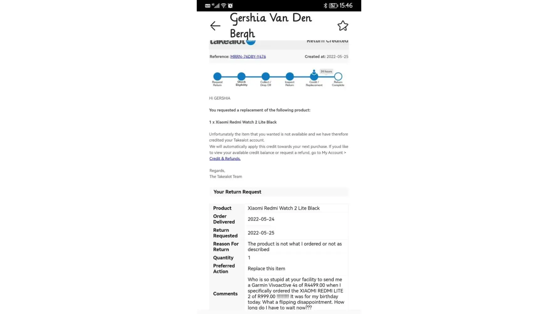 On Monday 23 May 2022 my wife ordered me a Xiaomi Redmi Watch 2 Lite for my birthday on 25 May 2022. The normal price was R1199 but they advertised it for R999 when she ordered. She paid the extra R70 to get it to me on the 24th of May. It arrived on time but because it was my present she didn't check the item in the box as to leave the box sealed for me to open.