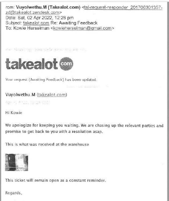My parents have been e-mailing and calling takealot since the day this happened on 26 March 2022. On 02 April 2022 one of their agents sent a photo proving that our Private Suitcases (worth R5000 years ago when it was bought internationally) was received along with the other broken suitcases which we bought from them, that only made 1 trip then broke.