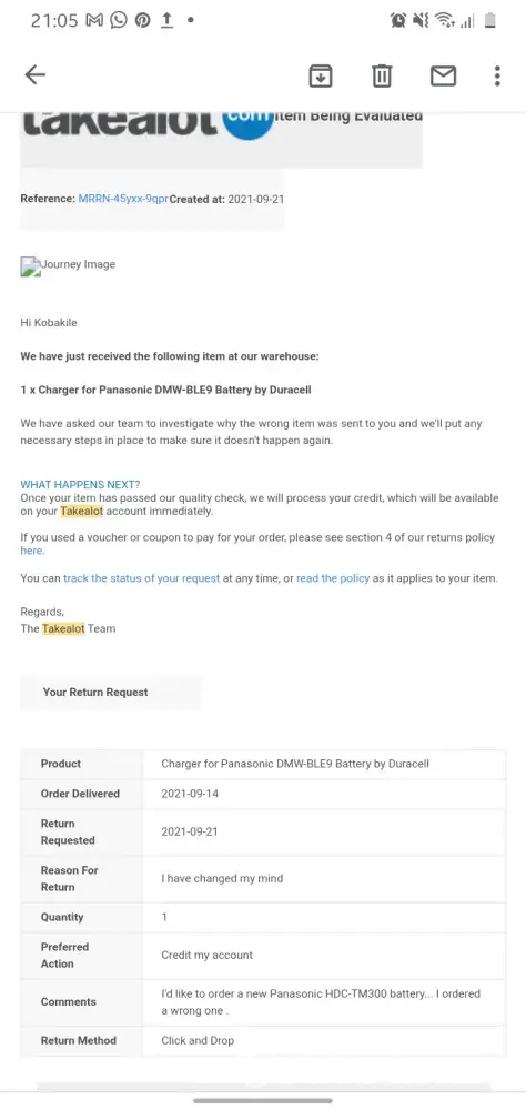 On the 10th of September I ordered a DMW-BLE9 battery by Duracell and got delivered on the 14th of September 2021... but I ordered a wrong product and returned it to Mahikeng warehouse on the 21st of September 2021. I ordered again a charger for Panasonic VW-VBT190 and VW-VBT380 battery by Duracell on the 27th of September 2021 and got delivered on the 30th of September 2021 but they delivered a DMW-BLE9 again.